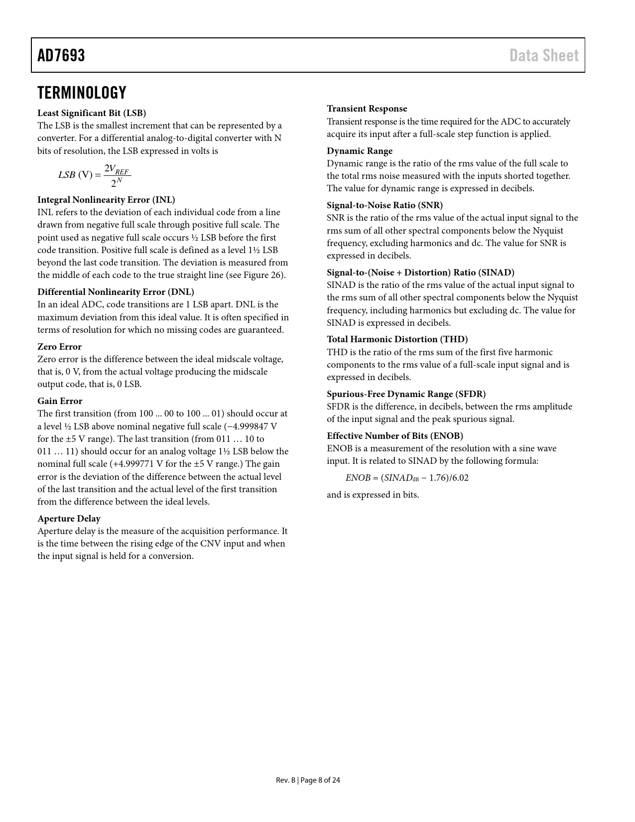 link to page 14 AD7693Data SheetTERMINOLOGY Least Significant Bit (LSB)Transient Response The LSB is the smallest increment that can be represented by a Transient response is the time required for the ADC to accurately converter. For a differential analog-to-digital converter with N acquire its input after a full-scale step function is applied. bits of resolution, the LSB expressed in volts is Dynamic Range Dynamic range is the ratio of the rms value of the full scale to V 2 REF LSB (V) = the total rms noise measured with the inputs shorted together. N 2 The value for dynamic range is expressed in decibels. Integral Nonlinearity Error (INL)Signal-to-Noise Ratio (SNR) INL refers to the deviation of each individual code from a line SNR is the ratio of the rms value of the actual input signal to the drawn from negative full scale through positive full scale. The rms sum of all other spectral components below the Nyquist point used as negative full scale occurs ½ LSB before the first frequency, excluding harmonics and dc. The value for SNR is code transition. Positive full scale is defined as a level 1½ LSB expressed in decibels. beyond the last code transition. The deviation is measured from the middle of each code to the true straight line (see Figure 26). Signal-to-(Noise + Distortion) Ratio (SINAD) SINAD is the ratio of the rms value of the actual input signal to Differential Nonlinearity Error (DNL) the rms sum of all other spectral components below the Nyquist In an ideal ADC, code transitions are 1 LSB apart. DNL is the frequency, including harmonics but excluding dc. The value for maximum deviation from this ideal value. It is often specified in SINAD is expressed in decibels. terms of resolution for which no missing codes are guaranteed. Total Harmonic Distortion (THD)Zero Error THD is the ratio of the rms sum of the first five harmonic Zero error is the difference between the ideal midscale voltage, components to the rms value of a full-scale input signal and is that is, 0 V, from the actual voltage producing the midscale expressed in decibels. output code, that is, 0 LSB. Spurious-Free Dynamic Range (SFDR)Gain Error SFDR is the difference, in decibels, between the rms amplitude The first transition (from 100 .. 00 to 100 .. 01) should occur at of the input signal and the peak spurious signal. a level ½ LSB above nominal negative full scale (−4.999847 V for the ±5 V range). The last transition (from 011 … 10 to Effective Number of Bits (ENOB) 011 … 11) should occur for an analog voltage 1½ LSB below the ENOB is a measurement of the resolution with a sine wave nominal full scale (+4.999771 V for the ±5 V range.) The gain input. It is related to SINAD by the following formula: error is the deviation of the difference between the actual level ENOB = (SINADdB − 1.76)/6.02 of the last transition and the actual level of the first transition and is expressed in bits. from the difference between the ideal levels. Aperture Delay Aperture delay is the measure of the acquisition performance. It is the time between the rising edge of the CNV input and when the input signal is held for a conversion. Rev. B | Page 8 of 24 Document Outline Features Applications Application Diagram General Description Table of Contents Revision History Specification Timing Specifications Absolute Maximum Ratings ESD Caution Pin Configuration and Function Descriptions Terminology Typical Performance Characteristics Theory of Operation Circuit Information Converter Operation Transfer Functions Typical Connection Diagram Analog Inputs Driver Amplifier Choice Single-Ended-to-Differential Driver Voltage Reference Input Power Supply Supplying the ADC from the Reference Digital Interface /CS Mode, 3-Wire Without Busy Indicator /CS Mode, 3-Wire with Busy Indicator /CS Mode, 4-Wire Without Busy Indicator /CS Mode, 4-Wire with Busy Indicator Chain Mode Without Busy Indicator Chain Mode with Busy Indicator Application Hints Layout Evaluating the AD7693 Performance Outline Dimensions Ordering Guide