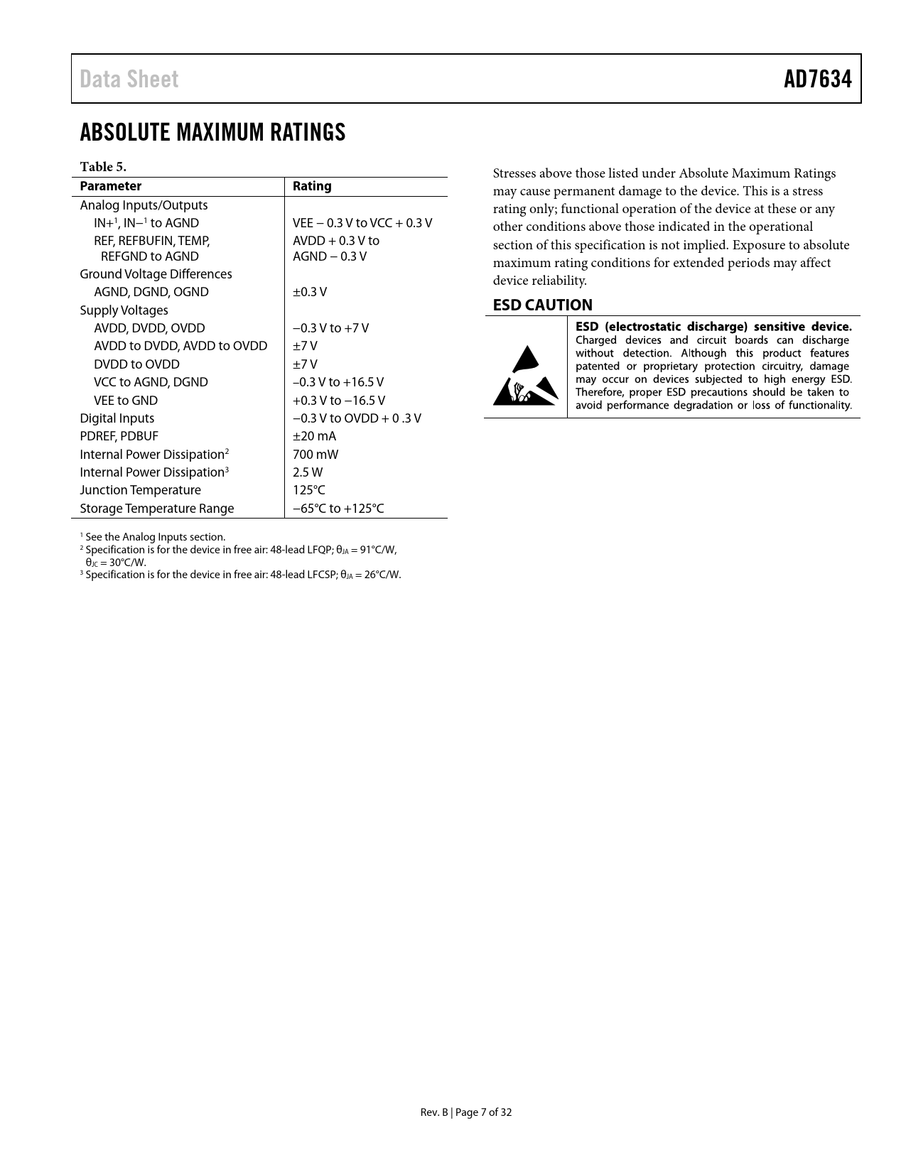 Data Sheet AD7634 ABSOLUTE MAXIMUM RATINGS Table 5 Parameter Rating ESD CAUTION