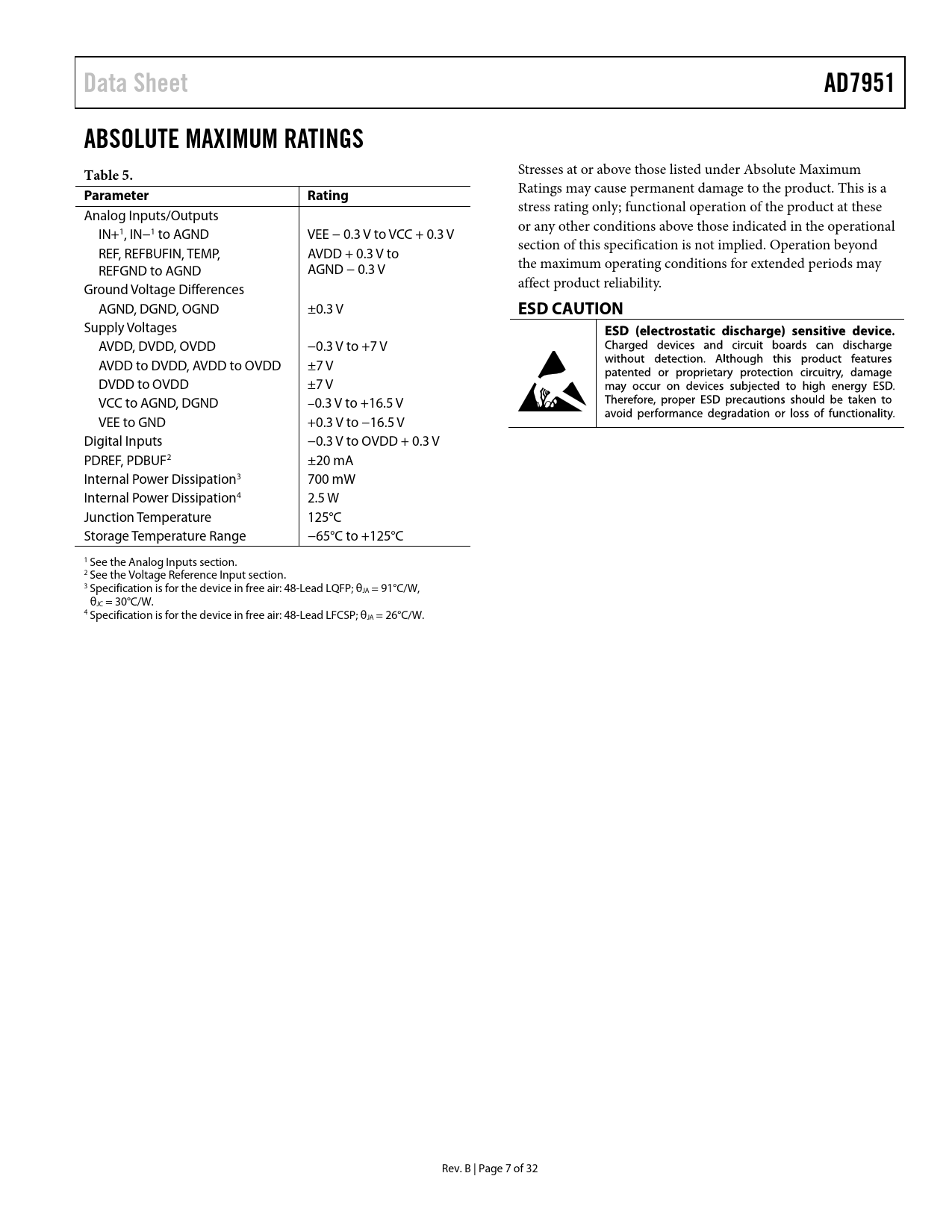 Data Sheet AD7951 ABSOLUTE MAXIMUM RATINGS Table 5 Parameter Rating ESD CAUTION