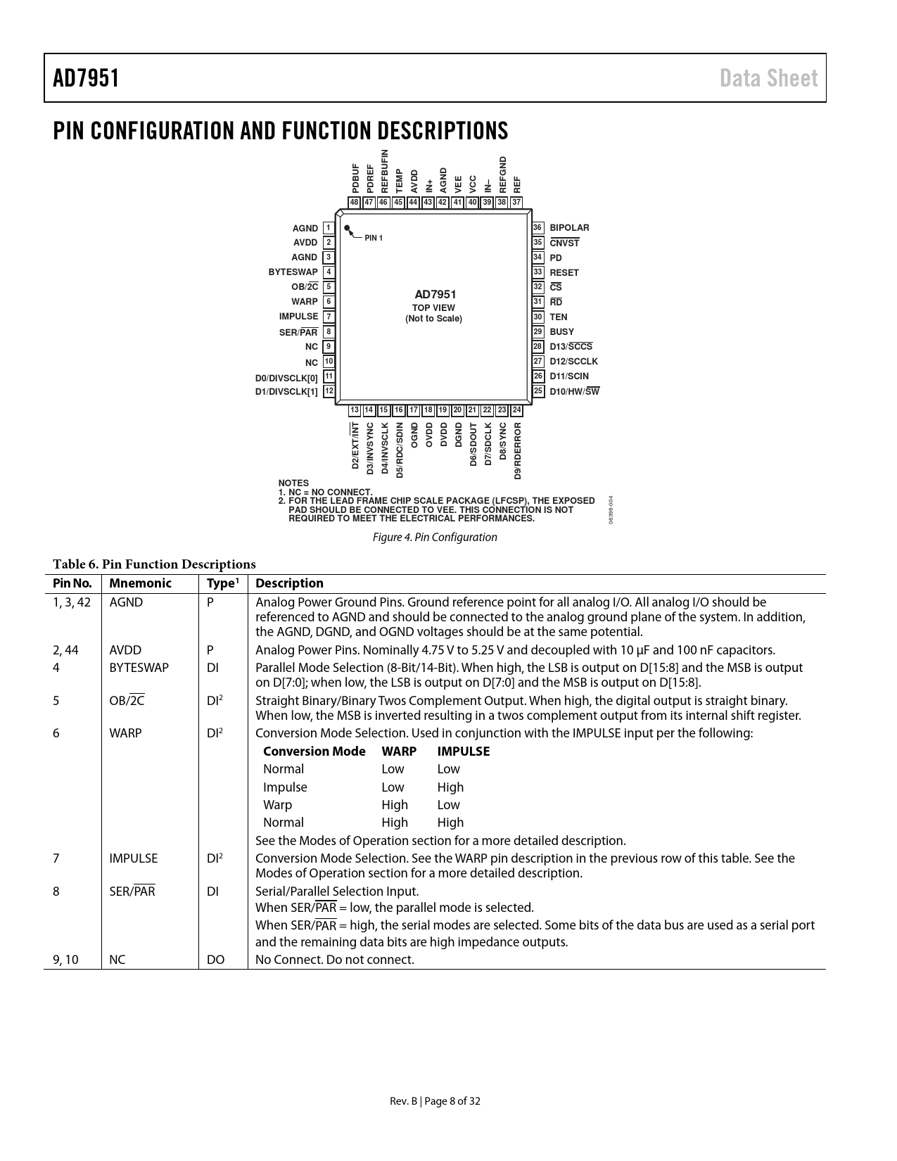 AD7951 Data Sheet PIN CONFIGURATION AND FUNCTION DESCRIPTIONS BUF DBUF DRE IN+ VEE IN– 48 47 46 45 44 43 42 41 40 39 38 37 AGND