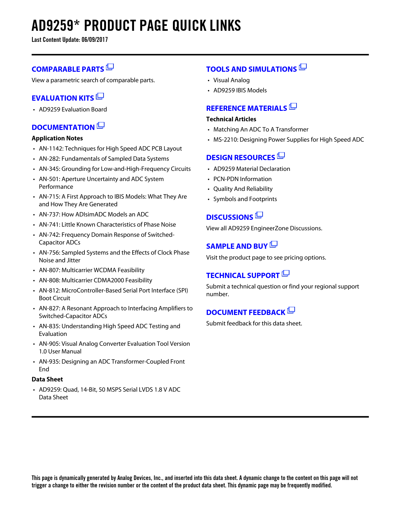 AD9259* PRODUCT PAGE QUICK LINKS Last Content Update: 06/09/2017COMPARABLE PARTSTOOLS AND SIMULATIONS View a parametric search of comparable parts. • Visual Analog • AD9259 IBIS Models EVALUATION KITS • AD9259 Evaluation Board REFERENCE MATERIALSTechnical ArticlesDOCUMENTATION • Matching An ADC To A Transformer Application Notes • MS-2210: Designing Power Supplies for High Speed ADC • AN-1142: Techniques for High Speed ADC PCB Layout • AN-282: Fundamentals of Sampled Data Systems DESIGN RESOURCES • AN-345: Grounding for Low-and-High-Frequency Circuits • AD9259 Material Declaration • AN-501: Aperture Uncertainty and ADC System • PCN-PDN Information Performance • Quality And Reliability • AN-715: A First Approach to IBIS Models: What They Are • Symbols and Footprints and How They Are Generated • AN-737: How ADIsimADC Models an ADC DISCUSSIONS • AN-741: Little Known Characteristics of Phase Noise View all AD9259 EngineerZone Discussions. • AN-742: Frequency Domain Response of Switched- Capacitor ADCs SAMPLE AND BUY • AN-756: Sampled Systems and the Effects of Clock Phase Noise and Jitter Visit the product page to see pricing options. • AN-807: Multicarrier WCDMA Feasibility TECHNICAL SUPPORT • AN-808: Multicarrier CDMA2000 Feasibility Submit a technical question or find your regional support • AN-812: MicroController-Based Serial Port Interface (SPI) number. Boot Circuit • AN-827: A Resonant Approach to Interfacing Amplifiers to DOCUMENT FEEDBACK Switched-Capacitor ADCs • AN-835: Understanding High Speed ADC Testing and Submit feedback for this data sheet. Evaluation • AN-905: Visual Analog Converter Evaluation Tool Version 1.0 User Manual • AN-935: Designing an ADC Transformer-Coupled Front End Data Sheet • AD9259: Quad, 14-Bit, 50 MSPS Serial LVDS 1.8 V ADC Data Sheet This page is dynamically generated by Analog Devices, Inc., and inserted into this data sheet. A dynamic change to the content on this page will not trigger a change to either the revision number or the content of the product data sheet. This dynamic page may be frequently modified. Document Outline Features Applications General Description Functional Block Diagram Product Highlights Revision History Specifications AC Specifications Digital Specifications Switching Specifications Timing Diagrams Absolute Maximum Ratings Thermal Impedance ESD Caution Pin Configuration and Function Descriptions Equivalent Circuits Typical Performance Characteristics Theory of Operation Analog Input Considerations Differential Input Configurations Single-Ended Input Configuration Clock Input Considerations Clock Duty Cycle Considerations Clock Jitter Considerations Power Dissipation and Power-Down Mode Digital Outputs and Timing SDIO/ODM Pin SCLK/DTP Pin CSB Pin RBIAS Pin Voltage Reference Internal Reference Operation External Reference Operation Serial Port Interface (SPI) Hardware Interface Memory Map Reading the Memory Map Table Reserved Locations Default Values Logic Levels Power and Ground Recommendations Exposed Paddle Thermal Heat Slug Recommendations Evaluation Board Power Supplies Input Signals Output Signals Default Operation and Jumper Selection Settings Alternative Analog Input Drive Configuration Outline Dimensions Ordering Guide