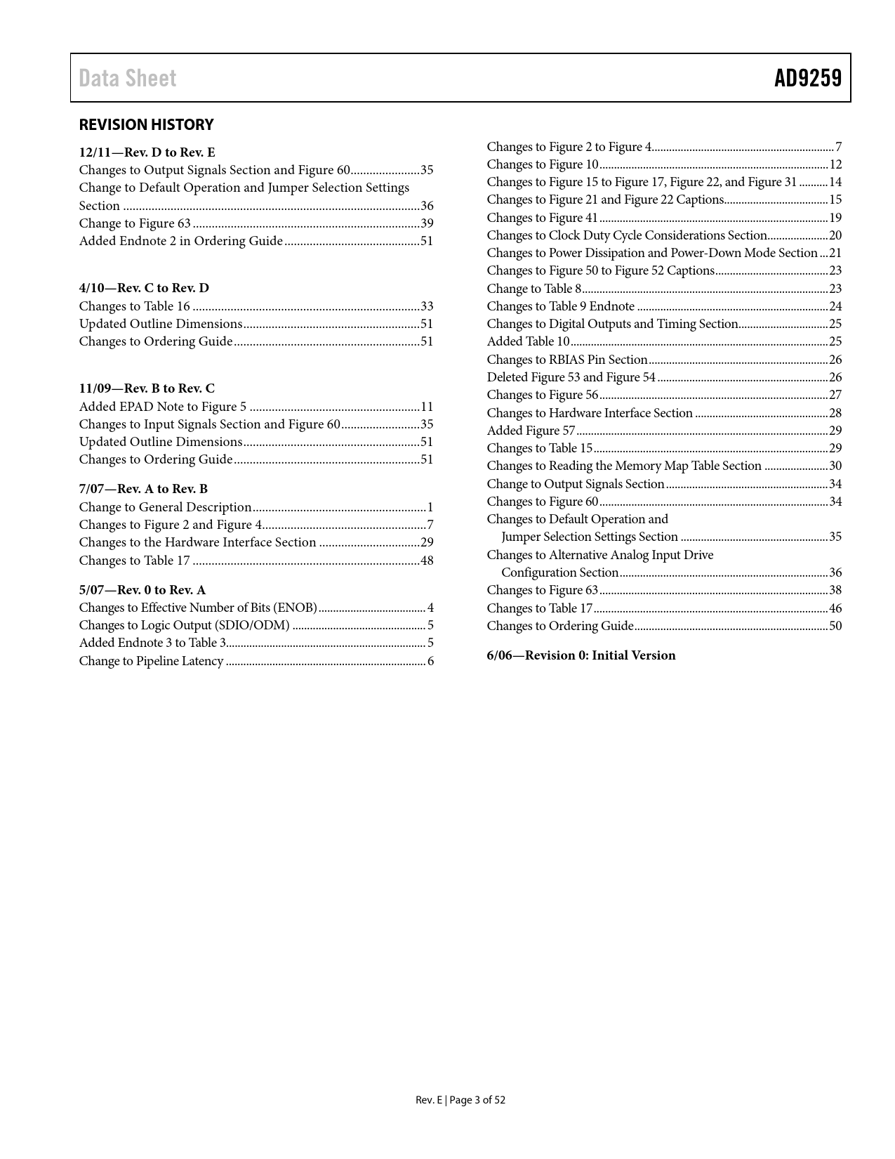 Seiten / Seite53 / 4 — Data Sheet. AD9259. REVISION HISTORY. 12/11—Rev. D to Rev. E. 4/10—Rev. C …