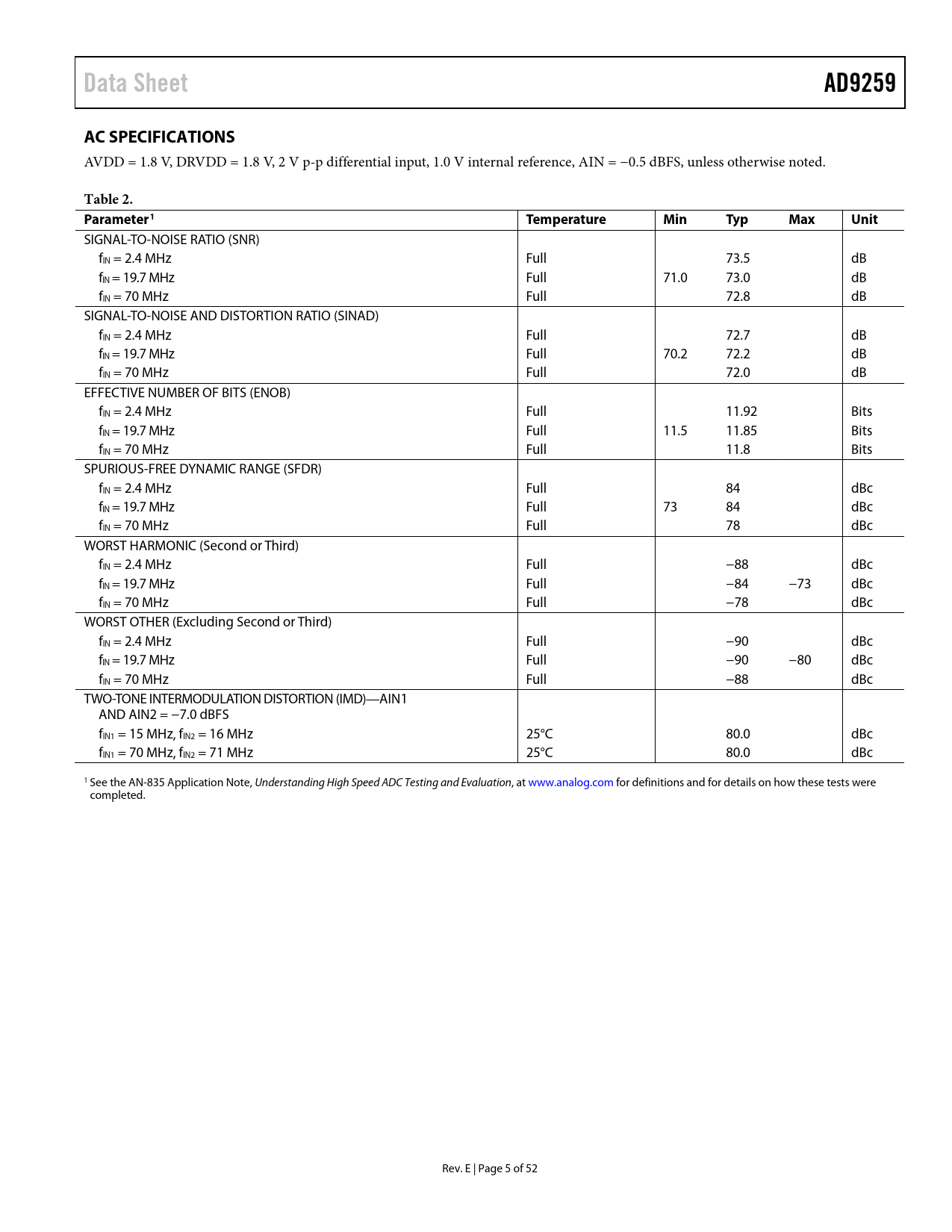 link to page 8 link to page 6 Data SheetAD9259AC SPECIFICATIONS AVDD = 1.8 V, DRVDD = 1.8 V, 2 V p-p differential input, 1.0 V internal reference, AIN = −0.5 dBFS, unless otherwise noted. Table 2. Parameter1TemperatureMinTypMaxUnit SIGNAL-TO-NOISE RATIO (SNR) fIN = 2.4 MHz Full 73.5 dB fIN = 19.7 MHz Full 71.0 73.0 dB fIN = 70 MHz Full 72.8 dB SIGNAL-TO-NOISE AND DISTORTION RATIO (SINAD) fIN = 2.4 MHz Full 72.7 dB fIN = 19.7 MHz Full 70.2 72.2 dB fIN = 70 MHz Full 72.0 dB EFFECTIVE NUMBER OF BITS (ENOB) fIN = 2.4 MHz Full 11.92 Bits fIN = 19.7 MHz Full 11.5 11.85 Bits fIN = 70 MHz Full 11.8 Bits SPURIOUS-FREE DYNAMIC RANGE (SFDR) fIN = 2.4 MHz Full 84 dBc fIN = 19.7 MHz Full 73 84 dBc fIN = 70 MHz Full 78 dBc WORST HARMONIC (Second or Third) fIN = 2.4 MHz Full −88 dBc fIN = 19.7 MHz Full −84 −73 dBc fIN = 70 MHz Full −78 dBc WORST OTHER (Excluding Second or Third) fIN = 2.4 MHz Full −90 dBc fIN = 19.7 MHz Full −90 −80 dBc fIN = 70 MHz Full −88 dBc TWO-TONE INTERMODULATION DISTORTION (IMD)—AIN1 AND AIN2 = −7.0 dBFS fIN1 = 15 MHz, fIN2 = 16 MHz 25°C 80.0 dBc fIN1 = 70 MHz, fIN2 = 71 MHz 25°C 80.0 dBc 1 See the AN-835 Application Note, Understanding High Speed ADC Testing and Evaluation, at www.analog.com for definitions and for details on how these tests were completed. Rev. E | Page 5 of 52 Document Outline Features Applications General Description Functional Block Diagram Product Highlights Revision History Specifications AC Specifications Digital Specifications Switching Specifications Timing Diagrams Absolute Maximum Ratings Thermal Impedance ESD Caution Pin Configuration and Function Descriptions Equivalent Circuits Typical Performance Characteristics Theory of Operation Analog Input Considerations Differential Input Configurations Single-Ended Input Configuration Clock Input Considerations Clock Duty Cycle Considerations Clock Jitter Considerations Power Dissipation and Power-Down Mode Digital Outputs and Timing SDIO/ODM Pin SCLK/DTP Pin CSB Pin RBIAS Pin Voltage Reference Internal Reference Operation External Reference Operation Serial Port Interface (SPI) Hardware Interface Memory Map Reading the Memory Map Table Reserved Locations Default Values Logic Levels Power and Ground Recommendations Exposed Paddle Thermal Heat Slug Recommendations Evaluation Board Power Supplies Input Signals Output Signals Default Operation and Jumper Selection Settings Alternative Analog Input Drive Configuration Outline Dimensions Ordering Guide