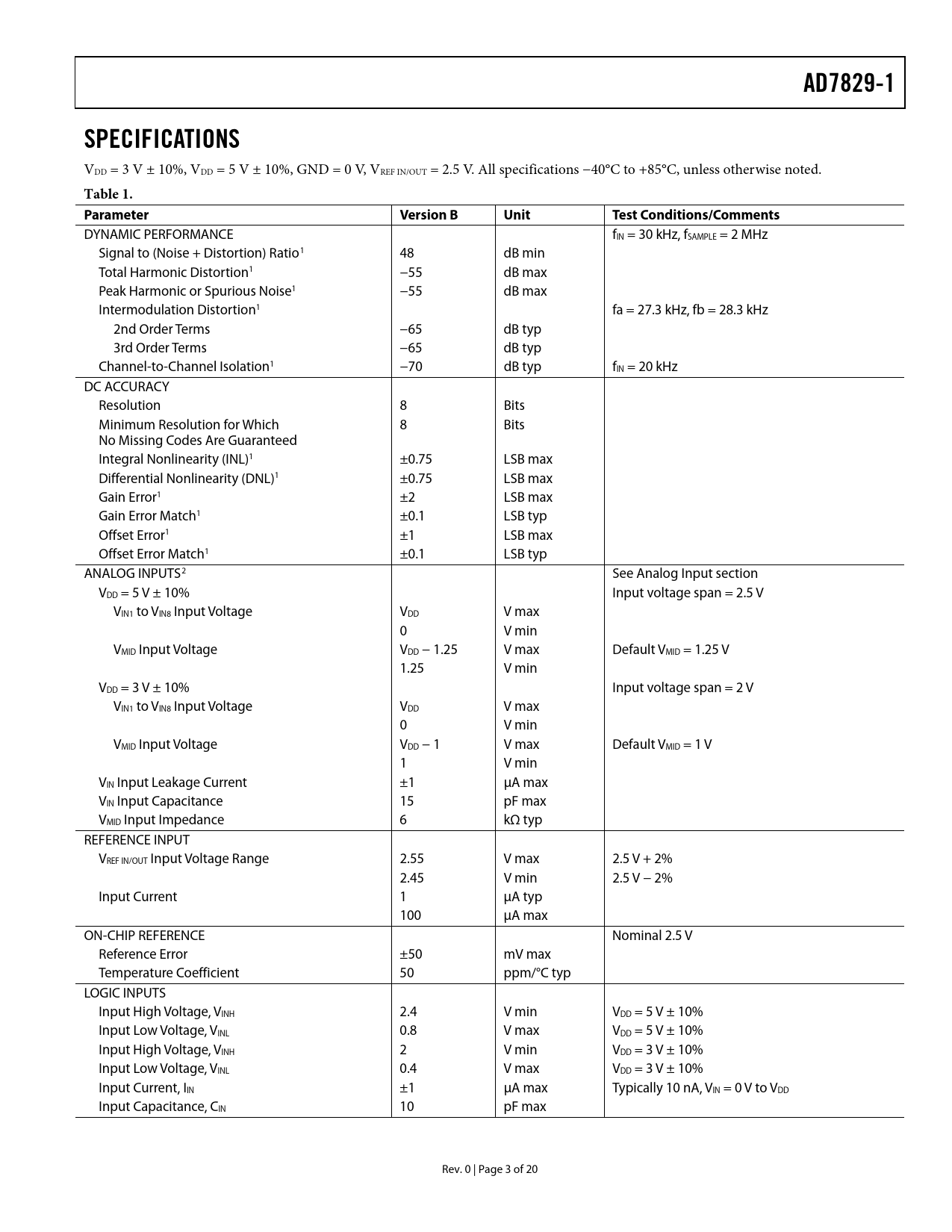 AD7829-1. SPECIFICATIONS. Table 1. Parameter. Version B. Unit. Test Conditions/Comments