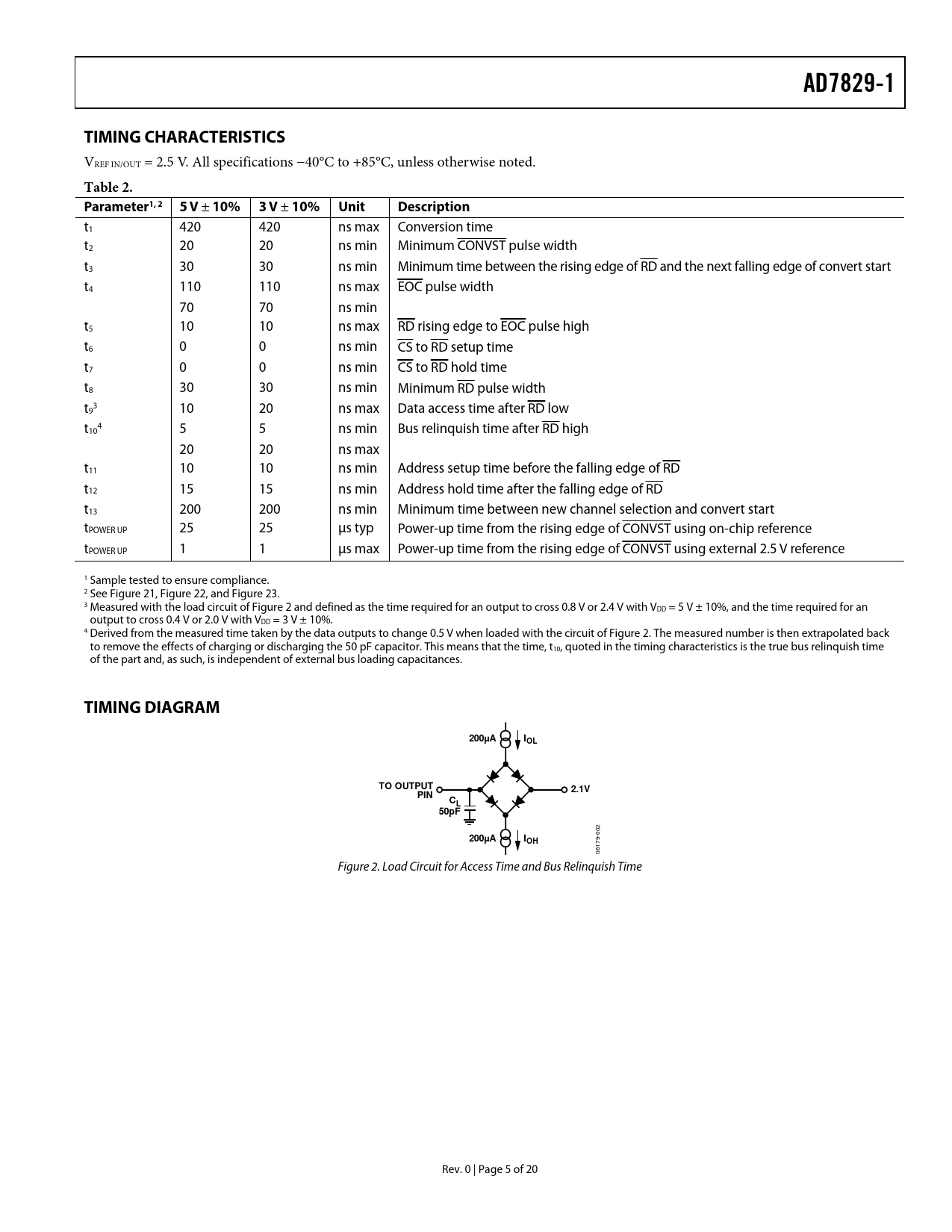 link to page 21 link to page 6 link to page 6 link to page 6 link to page 16 link to page 17 link to page 18 link to page 6 link to page 6 AD7829-1TIMING CHARACTERISTICS VREF IN/OUT = 2.5 V. All specifications −40°C to +85°C, unless otherwise noted. Table 2. Parameter1, 25V ± 10%3 V ± 10%UnitDescription t1 420 420 ns max Conversion time t2 20 20 ns min Minimum CONVST pulse width t3 30 30 ns min Minimum time between the rising edge of RD and the next falling edge of convert start t4 110 110 ns max EOC pulse width 70 70 ns min t5 10 10 ns max RD rising edge to EOC pulse high t6 0 0 ns min CS to RD setup time t7 0 0 ns min CS to RD hold time t8 30 30 ns min Minimum RD pulse width t 3 9 10 20 ns max Data access time after RD low t 4 10 5 5 ns min Bus relinquish time after RD high 20 20 ns max t11 10 10 ns min Address setup time before the falling edge of RD t12 15 15 ns min Address hold time after the falling edge of RD t13 200 200 ns min Minimum time between new channel selection and convert start tPOWER UP 25 25 μs typ Power-up time from the rising edge of CONVST using on-chip reference tPOWER UP 1 1 μs max Power-up time from the rising edge of CONVST using external 2.5 V reference 1 Sample tested to ensure compliance. 2 See Figure 21, Figure 22, and Figure 23. 3 Measured with the load circuit of Figure 2 and defined as the time required for an output to cross 0.8 V or 2.4 V with VDD = 5 V ± 10%, and the time required for an output to cross 0.4 V or 2.0 V with VDD = 3 V ± 10%. 4 Derived from the measured time taken by the data outputs to change 0.5 V when loaded with the circuit of Figure 2. The measured number is then extrapolated back to remove the effects of charging or discharging the 50 pF capacitor. This means that the time, t10, quoted in the timing characteristics is the true bus relinquish time of the part and, as such, is independent of external bus loading capacitances. TIMING DIAGRAM200µAIOLTO OUTPUT2.1VPINCL50pF 2 200µAI -00 OH 79 061 Figure 2. Load Circuit for Access Time and Bus Relinquish Time Rev. 0 | Page 5 of 20 Document Outline FEATURES APPLICATIONS GENERAL DESCRIPTION FUNCTIONAL BLOCK DIAGRAM PRODUCT HIGHLIGHTS TABLE OF CONTENTS REVISION HISTORY SPECIFICATIONS TIMING CHARACTERISTICS TIMING DIAGRAM ABSOLUTE MAXIMUM RATINGS ESD CAUTION PIN CONFIGURATION AND FUNCTION DESCRIPTIONS TERMINOLOGY CIRCUIT INFORMATION CIRCUIT DESCRIPTION TYPICAL CONNECTION DIAGRAM ADC TRANSFER FUNCTION ANALOG INPUT POWER-UP TIMES POWER VS. THROUGHPUT OPERATING MODES PARALLEL INTERFACE MICROPROCESSOR INTERFACING AD7829-1 TO 8051 AD7829-1 TO PIC16C6x/PIC16C7x AD7829-1 TO ADSP-21xx INTERFACING MULTIPLEXER ADDRESS INPUTS OUTLINE DIMENSIONS ORDERING GUIDE