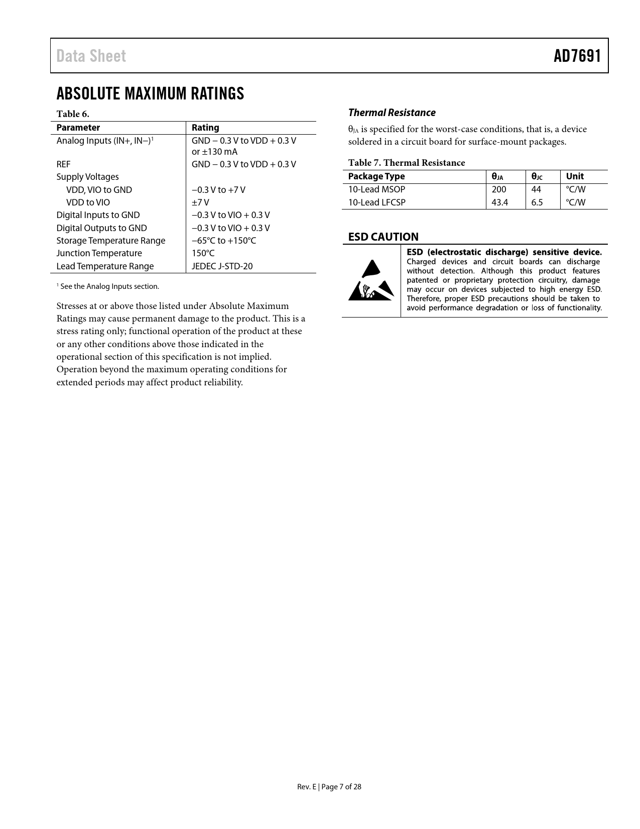 link to page 16 Data SheetAD7691ABSOLUTE MAXIMUM RATINGS Table 6.Thermal ResistanceParameterRating θJA is specified for the worst-case conditions, that is, a device Analog Inputs (IN+, IN−)1 GND − 0.3 V to VDD + 0.3 V soldered in a circuit board for surface-mount packages. or ±130 mA REF GND − 0.3 V to VDD + 0.3 V Table 7. Thermal Resistance Supply Voltages Package TypeθJAθJCUnit VDD, VIO to GND −0.3 V to +7 V 10-Lead MSOP 200 44 °C/W VDD to VIO ±7 V 10-Lead LFCSP 43.4 6.5 °C/W Digital Inputs to GND −0.3 V to VIO + 0.3 V Digital Outputs to GND −0.3 V to VIO + 0.3 V Storage Temperature Range −65°C to +150°C ESD CAUTION Junction Temperature 150°C Lead Temperature Range JEDEC J-STD-20 1 See the Analog Inputs section. Stresses at or above those listed under Absolute Maximum Ratings may cause permanent damage to the product. This is a stress rating only; functional operation of the product at these or any other conditions above those indicated in the operational section of this specification is not implied. Operation beyond the maximum operating conditions for extended periods may affect product reliability. Rev. E | Page 7 of 28 Document Outline FEATURES APPLICATIONS APPLICATION DIAGRAM GENERAL DESCRIPTION TABLE OF CONTENTS REVISION HISTORY SPECIFICATIONS TIMING SPECIFICATIONS ABSOLUTE MAXIMUM RATINGS Thermal Resistance ESD CAUTION PIN CONFIGURATIONS AND FUNCTION DESCRIPTIONS TYPICAL PERFORMANCE CHARACTERISTICS TERMINOLOGY THEORY OF OPERATION CIRCUIT INFORMATION CONVERTER OPERATION Transfer Functions TYPICAL CONNECTION DIAGRAM ANALOG INPUTS DRIVER AMPLIFIER CHOICE SINGLE-TO-DIFFERENTIAL DRIVER VOLTAGE REFERENCE INPUT POWER SUPPLY SUPPLYING THE ADC FROM THE REFERENCE DIGITAL INTERFACE CS\ MODE, 3-WIRE WITHOUT BUSY INDICATOR CS\ MODE, 3-WIRE WITH BUSY INDICATOR CS\ MODE, 4-WIRE WITHOUT BUSY INDICATOR CS\ MODE, 4-WIRE WITH BUSY INDICATOR CHAIN MODE WITHOUT BUSY INDICATOR CHAIN MODE WITH BUSY INDICATOR APPLICATION HINTS LAYOUT EVALUATING THE AD7691 PERFORMANCE OUTLINE DIMENSIONS ORDERING GUIDE