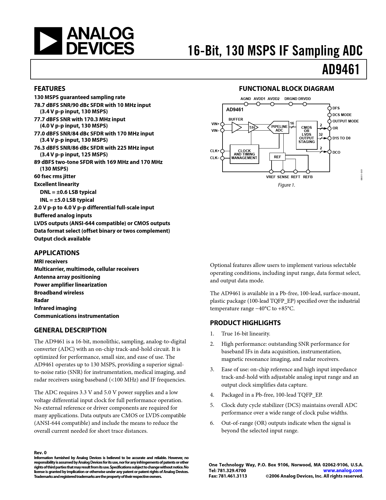 16-Bit, 130 MSPS IF Sampling ADC. AD9461. FEATURES. FUNCTIONAL BLOCK DIAGRAM. 130 MSPS guaranteed sampling rate. AGND AVDD1 AVDD2