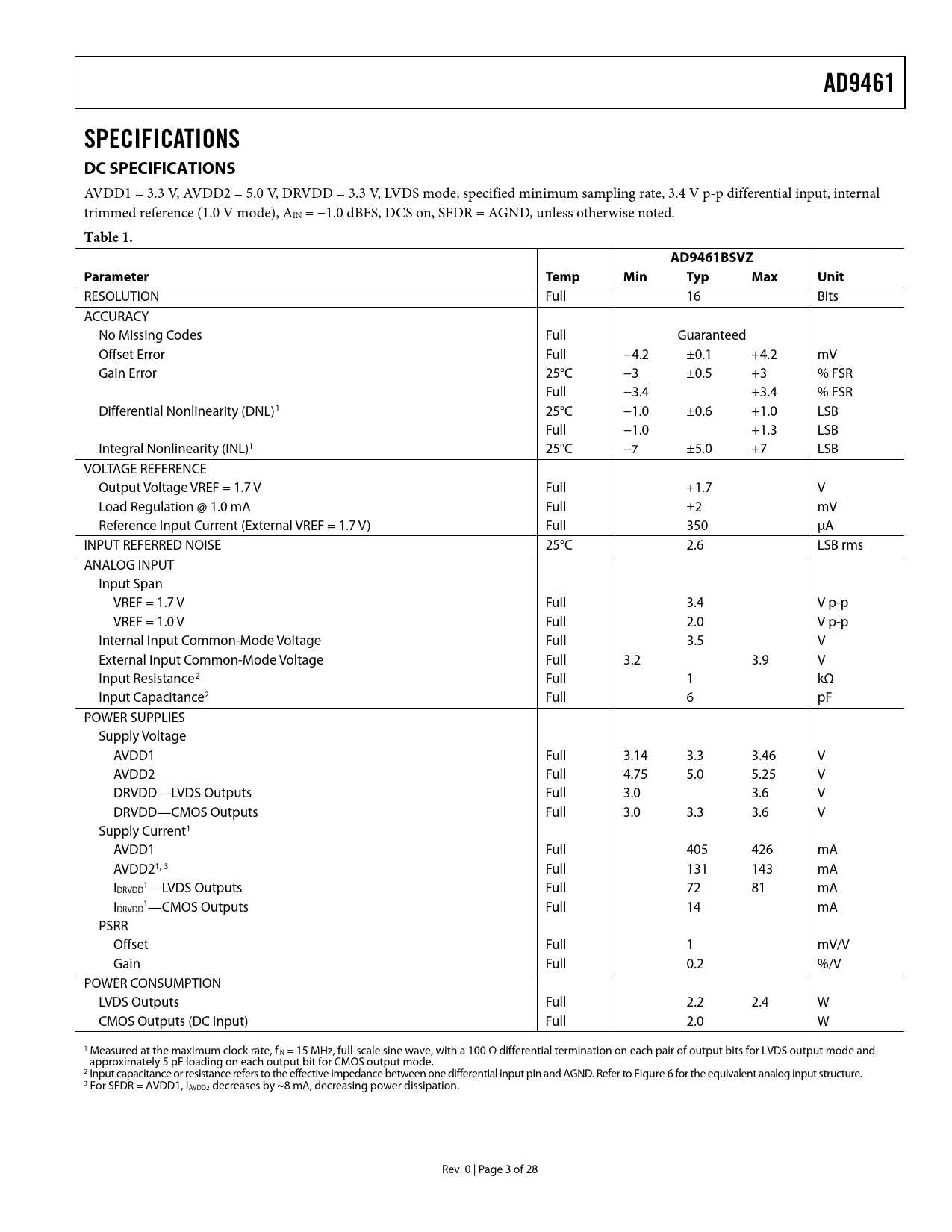 AD9461 SPECIFICATIONS DC SPECIFICATIONS Table 1 AD9461BSVZ Parameter Temp Min Typ Max Unit