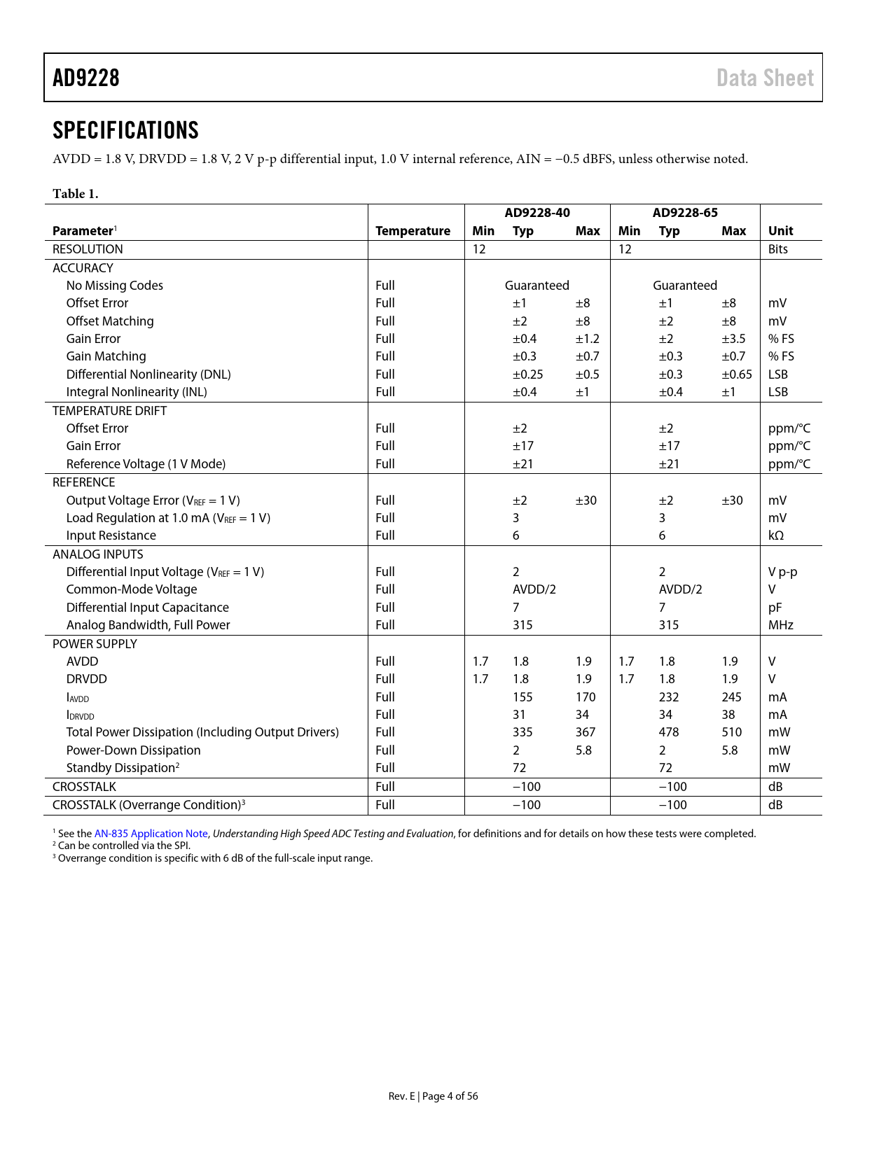 AD9228. Data Sheet. SPECIFICATIONS. Table 1. AD9228-40. AD9228-65. Parameter. emperature. Min. Typ. Max. Unit