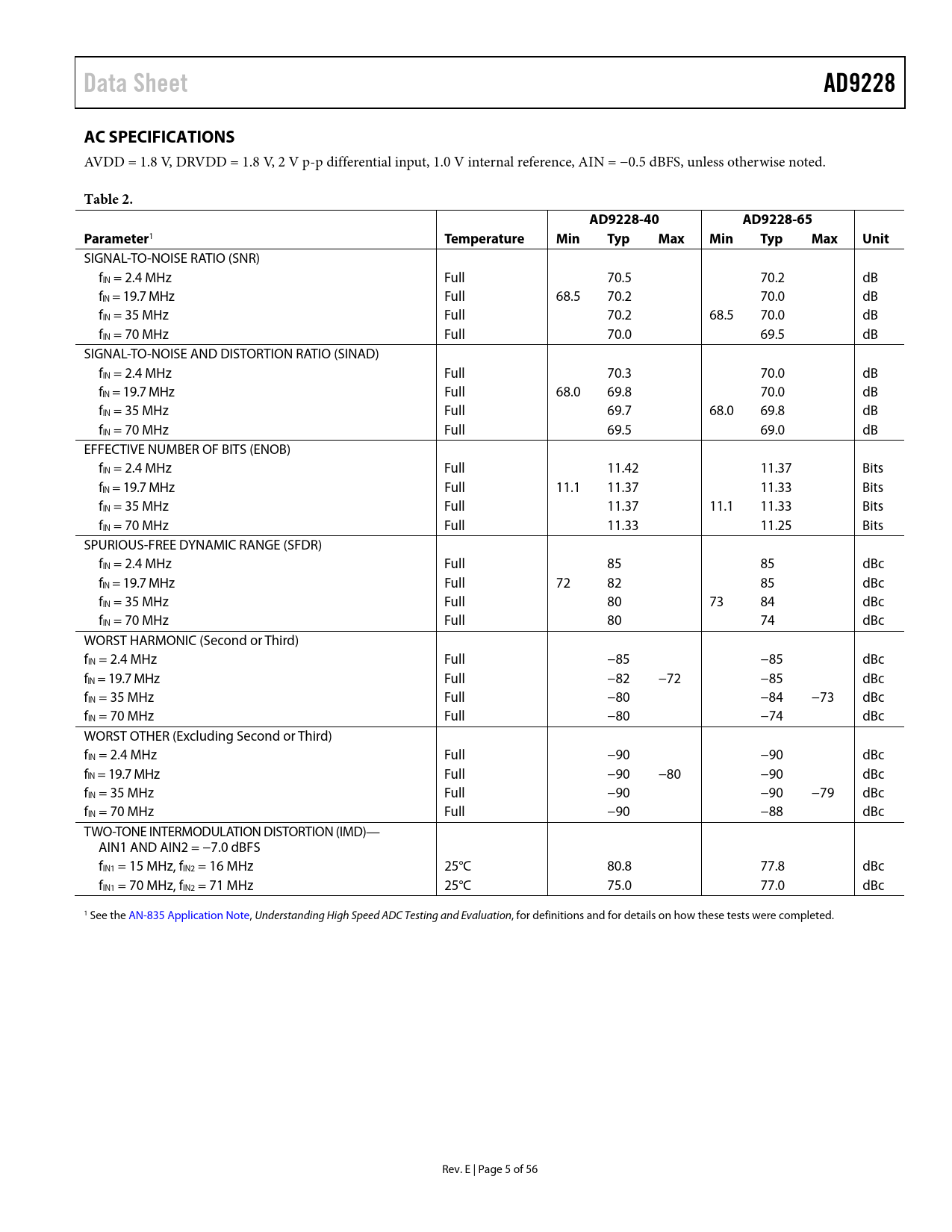 link to page 8 link to page 6 Data SheetAD9228AC SPECIFICATIONS AVDD = 1.8 V, DRVDD = 1.8 V, 2 V p-p differential input, 1.0 V internal reference, AIN = −0.5 dBFS, unless otherwise noted. Table 2.AD9228-40AD9228-65Parameter 1 Temperature Min Typ Max Min Typ Max Unit SIGNAL-TO-NOISE RATIO (SNR) fIN = 2.4 MHz Full 70.5 70.2 dB fIN = 19.7 MHz Full 68.5 70.2 70.0 dB fIN = 35 MHz Full 70.2 68.5 70.0 dB fIN = 70 MHz Full 70.0 69.5 dB SIGNAL-TO-NOISE AND DISTORTION RATIO (SINAD) fIN = 2.4 MHz Full 70.3 70.0 dB fIN = 19.7 MHz Full 68.0 69.8 70.0 dB fIN = 35 MHz Full 69.7 68.0 69.8 dB fIN = 70 MHz Full 69.5 69.0 dB EFFECTIVE NUMBER OF BITS (ENOB) fIN = 2.4 MHz Full 11.42 11.37 Bits fIN = 19.7 MHz Full 11.1 11.37 11.33 Bits fIN = 35 MHz Full 11.37 11.1 11.33 Bits fIN = 70 MHz Full 11.33 11.25 Bits SPURIOUS-FREE DYNAMIC RANGE (SFDR) fIN = 2.4 MHz Full 85 85 dBc fIN = 19.7 MHz Full 72 82 85 dBc fIN = 35 MHz Full 80 73 84 dBc fIN = 70 MHz Full 80 74 dBc WORST HARMONIC (Second or Third) fIN = 2.4 MHz Full −85 −85 dBc fIN = 19.7 MHz Full −82 −72 −85 dBc fIN = 35 MHz Full −80 −84 −73 dBc fIN = 70 MHz Full −80 −74 dBc WORST OTHER (Excluding Second or Third) fIN = 2.4 MHz Full −90 −90 dBc fIN = 19.7 MHz Full −90 −80 −90 dBc fIN = 35 MHz Full −90 −90 −79 dBc fIN = 70 MHz Full −90 −88 dBc TWO-TONE INTERMODULATION DISTORTION (IMD)— AIN1 AND AIN2 = −7.0 dBFS fIN1 = 15 MHz, fIN2 = 16 MHz 25°C 80.8 77.8 dBc fIN1 = 70 MHz, fIN2 = 71 MHz 25°C 75.0 77.0 dBc 1 See the AN-835 Application Note, Understanding High Speed ADC Testing and Evaluation, for definitions and for details on how these tests were completed. Rev. E | Page 5 of 56 Document Outline Features Applications General Description Functional Block Diagram Product Highlights Revision History Specifications AC Specifications Digital Specifications Switching Specifications Timing Diagrams Absolute Maximum Ratings Thermal Impedance ESD Caution Pin Configuration and Function Descriptions Equivalent Circuits Typical Performance Characteristics Theory of Operation Analog Input Considerations Differential Input Configurations Single-Ended Input Configuration Clock Input Considerations Clock Duty Cycle Considerations Clock Jitter Considerations Power Dissipation and Power-Down Mode Digital Outputs and Timing SDIO/ODM Pin SCLK/DTP Pin CSB Pin RBIAS Pin Voltage Reference Internal Reference Operation External Reference Operation Serial Port Interface (SPI) Hardware Interface Memory Map Reading the Memory Map Table Reserved Locations Default Values Logic Levels Power and Ground Recommendations Exposed Paddle Thermal Heat Slug Recommendations Evaluation Board Power Supplies Input Signals Output Signals Default Operation and Jumper Selection Settings Alternative Analog Input Drive Configuration Outline Dimensions Ordering Guide