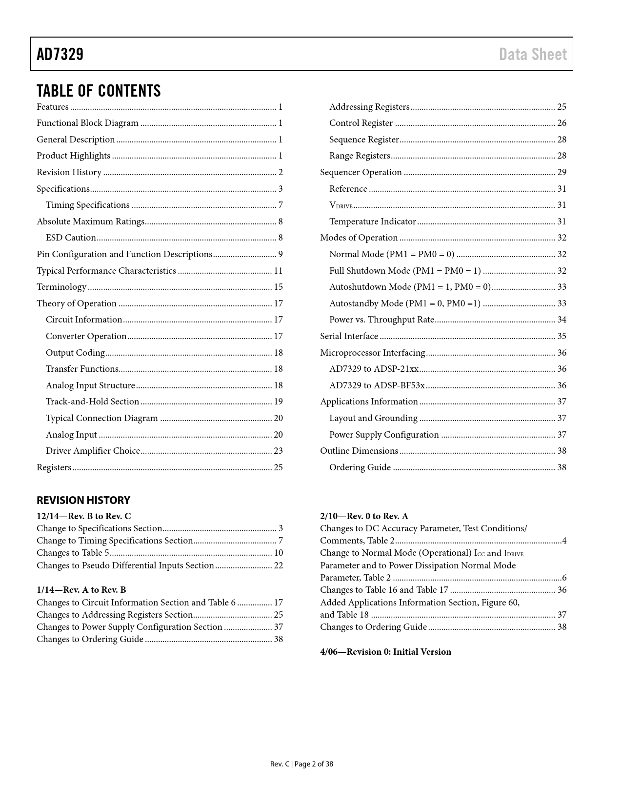 AD7329 Data Sheet TABLE OF CONTENTS REVISION HISTORY 12/14—Rev B to Rev C 2/10—Rev 0 to Rev A 1/14—Rev A to Rev B