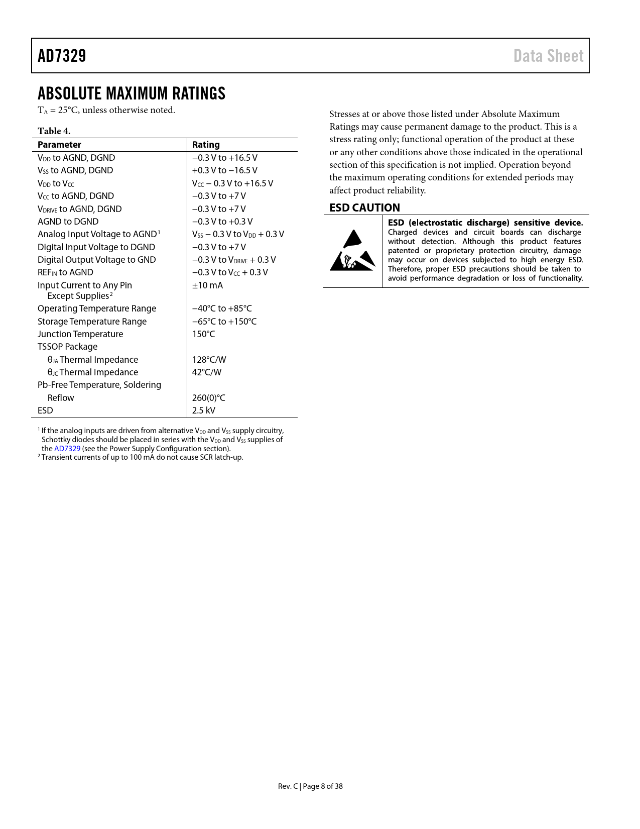 AD7329. Data Sheet. ABSOLUTE MAXIMUM RATINGS. Table 4. Parameter. Rating. ESD CAUTION