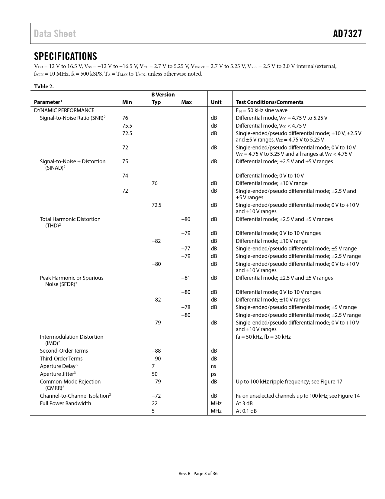 link to page 13 link to page 12 link to page 7 link to page 7 link to page 7 link to page 7 link to page 7 link to page 7 link to page 7 link to page 7 link to page 7 link to page 7 Data SheetAD7327SPECIFICATIONS VDD = 12 V to 16.5 V, VSS = −12 V to −16.5 V, VCC = 2.7 V to 5.25 V, VDRIVE = 2.7 V to 5.25 V, VREF = 2.5 V to 3.0 V internal/external, fSCLK = 10 MHz, fS = 500 kSPS, TA = TMAX to TMIN, unless otherwise noted. Table 2.B VersionParameter1MinTypMaxUnitTest Conditions/Comments DYNAMIC PERFORMANCE FIN = 50 kHz sine wave Signal-to-Noise Ratio (SNR)2 76 dB Differential mode, VCC = 4.75 V to 5.25 V 75.5 dB Differential mode, VCC < 4.75 V 72.5 dB Single-ended/pseudo differential mode; ±10 V, ±2.5 V and ±5 V ranges, VCC = 4.75 V to 5.25 V 72 dB Single-ended/pseudo differential mode; 0 V to 10 V VCC = 4.75 V to 5.25 V and all ranges at VCC < 4.75 V Signal-to-Noise + Distortion 75 dB Differential mode; ±2.5 V and ±5 V ranges (SINAD)2 74 Differential mode; 0 V to 10 V 76 dB Differential mode; ±10 V range 72 dB Single-ended/pseudo differential mode; ±2.5 V and ±5 V ranges 72.5 dB Single-ended/pseudo differential mode; 0 V to +10 V and ±10 V ranges Total Harmonic Distortion −80 dB Differential mode; ±2.5 V and ±5 V ranges (THD)2 −79 dB Differential mode; 0 V to 10 V ranges −82 dB Differential mode; ±10 V range −77 dB Single-ended/pseudo differential mode; ±5 V range −79 dB Single-ended/pseudo differential mode; ±2.5 V range −80 dB Single-ended/pseudo differential mode; 0 V to +10 V and ±10 V ranges Peak Harmonic or Spurious −81 dB Differential mode; ±2.5 V and ±5 V ranges Noise (SFDR)2 −80 dB Differential mode; 0 V to 10 V ranges −82 dB Differential mode; ±10 V ranges −78 dB Single-ended/pseudo differential mode; ±5 V range −80 Single-ended/pseudo differential mode; ±2.5 V range −79 dB Single-ended/pseudo differential mode; 0 V to +10 V and ±10 V ranges Intermodulation Distortion fa = 50 kHz, fb = 30 kHz (IMD)2 Second-Order Terms −88 dB Third-Order Terms −90 dB Aperture Delay3 7 ns Aperture Jitter3 50 ps Common-Mode Rejection −79 dB Up to 100 kHz ripple frequency; see Figure 17 (CMRR)2 Channel-to-Channel Isolation2 −72 dB FIN on unselected channels up to 100 kHz; see Figure 14 Full Power Bandwidth 22 MHz At 3 dB 5 MHz At 0.1 dB Rev. B | Page 3 of 36 Document Outline Features Functional Block Diagram General Description Product Highlights Table of Contents Revision History Specifications Timing Specifications Absolute Maximum Ratings ESD Caution Pin Configuration and Function Descriptions Typical Performance Characteristics Terminology Theory of Operation Circuit Information Converter Operation Output Coding Transfer Functions Analog Input Structure Track-and-Hold Section Typical Connection Diagram Analog Input Single-Ended Inputs True Differential Mode Pseudo Differential Inputs Driver Amplifier Choice Registers Addressing Registers Control Register Sequence Register Range Registers Sequencer Operation Reference VDRIVE Temperature Indicator Modes of Operation Normal Mode Full Shutdown Mode Autoshutdown Mode Autostandby Mode Power vs. Throughput Rate Serial Interface Microprocessor Interfacing AD7327 to ADSP-21xx AD7327 to ADSP-BF53x Application Hints Layout and Grounding Power Supply Configuration Outline Dimensions Ordering Guide