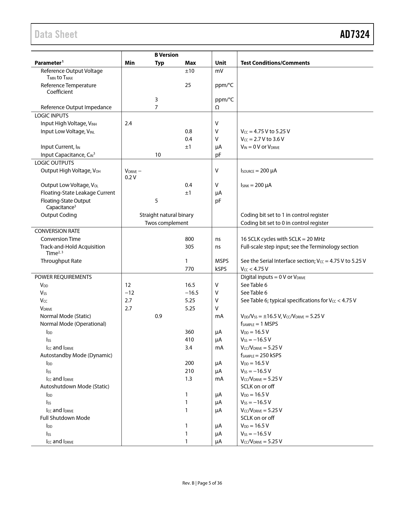 link to page 15 link to page 32 link to page 17 link to page 17 link to page 17 link to page 7 link to page 7 link to page 7 link to page 7 link to page 7 Data SheetAD7324B VersionParameter1MinTypMaxUnitTest Conditions/Comments Reference Output Voltage ±10 mV TMIN to TMAX Reference Temperature 25 ppm/°C Coefficient 3 ppm/°C Reference Output Impedance 7 Ω LOGIC INPUTS Input High Voltage, VINH 2.4 V Input Low Voltage, VINL 0.8 V VCC = 4.75 V to 5.25 V 0.4 V VCC = 2.7 V to 3.6 V Input Current, IIN ±1 µA VIN = 0 V or VDRIVE Input Capacitance, C 3 IN 10 pF LOGIC OUTPUTS Output High Voltage, VOH VDRIVE − V ISOURCE = 200 µA 0.2 V Output Low Voltage, VOL 0.4 V ISINK = 200 µA Floating-State Leakage Current ±1 µA Floating-State Output 5 pF Capacitance3 Output Coding Straight natural binary Coding bit set to 1 in control register Twos complement Coding bit set to 0 in control register CONVERSION RATE Conversion Time 800 ns 16 SCLK cycles with SCLK = 20 MHz Track-and-Hold Acquisition 305 ns Full-scale step input; see the Terminology section Time2, 3 Throughput Rate 1 MSPS See the Serial Interface section; VCC = 4.75 V to 5.25 V 770 kSPS VCC < 4.75 V POWER REQUIREMENTS Digital inputs = 0 V or VDRIVE VDD 12 16.5 V See Table 6 VSS −12 −16.5 V See Table 6 VCC 2.7 5.25 V See Table 6; typical specifications for VCC < 4.75 V VDRIVE 2.7 5.25 V Normal Mode (Static) 0.9 mA VDD/VSS = ±16.5 V, VCC/VDRIVE = 5.25 V Normal Mode (Operational) fSAMPLE = 1 MSPS IDD 360 µA VDD = 16.5 V ISS 410 µA VSS = −16.5 V ICC and IDRIVE 3.4 mA VCC/VDRIVE = 5.25 V Autostandby Mode (Dynamic) fSAMPLE = 250 kSPS IDD 200 µA VDD = 16.5 V ISS 210 µA VSS = −16.5 V ICC and IDRIVE 1.3 mA VCC/VDRIVE = 5.25 V Autoshutdown Mode (Static) SCLK on or off IDD 1 µA VDD = 16.5 V ISS 1 µA VSS = −16.5 V ICC and IDRIVE 1 µA VCC/VDRIVE = 5.25 V Full Shutdown Mode SCLK on or off IDD 1 µA VDD = 16.5 V ISS 1 µA VSS = −16.5 V ICC and IDRIVE 1 µA VCC/VDRIVE = 5.25 V Rev. B | Page 5 of 36 Document Outline Features Functional Block Diagram General Description Product Highlights Table of Contents Revision History Specifications Timing Specifications Absolute Maximum Ratings ESD Caution Pin Configuration and Function Description Typical Performance Characteristics Terminology Theory of Operation Circuit Information Converter Operation Output Coding Transfer Functions Analog Input Structure Track-and-Hold Section Typical Connection Diagram Analog Input Single-Ended Inputs True Differential Mode Pseudo Differential Inputs Driver Amplifier Choice Registers Addressing Registers Control Register Sequence Register Range Register Sequencer Operation Reference VDRIVE Modes of Operation Normal Mode Full Shutdown Mode Autoshutdown Mode Autostandby Mode Power vs. Throughput Rate Serial Interface Microprocessor Interfacing AD7324 to ADSP-21xx AD7324 to ADSP-BF53x Application Hints Layout and Grounding Power Supply Configuration Outline Dimensions Ordering Guide