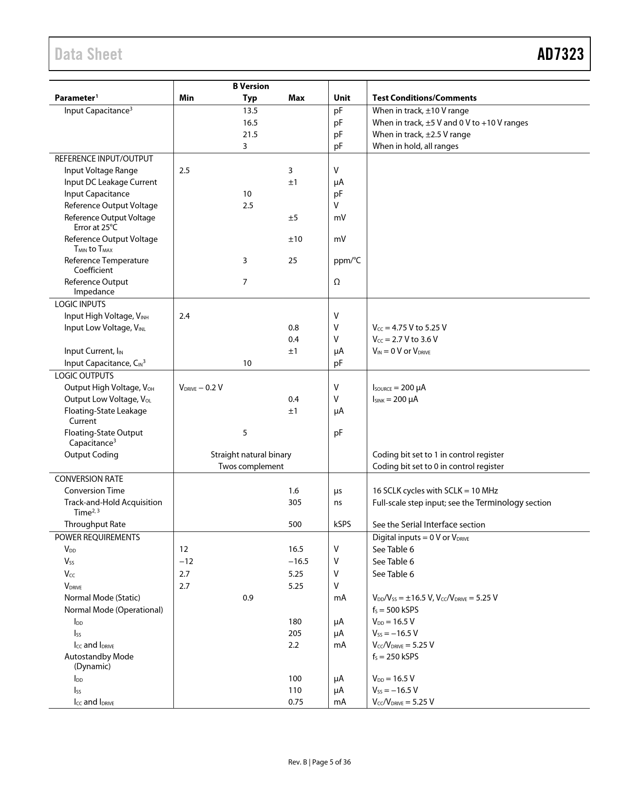 Data Sheet. AD7323. B Version. Parameter1. Min. Typ. Max. Unit. Test Conditions/Comments