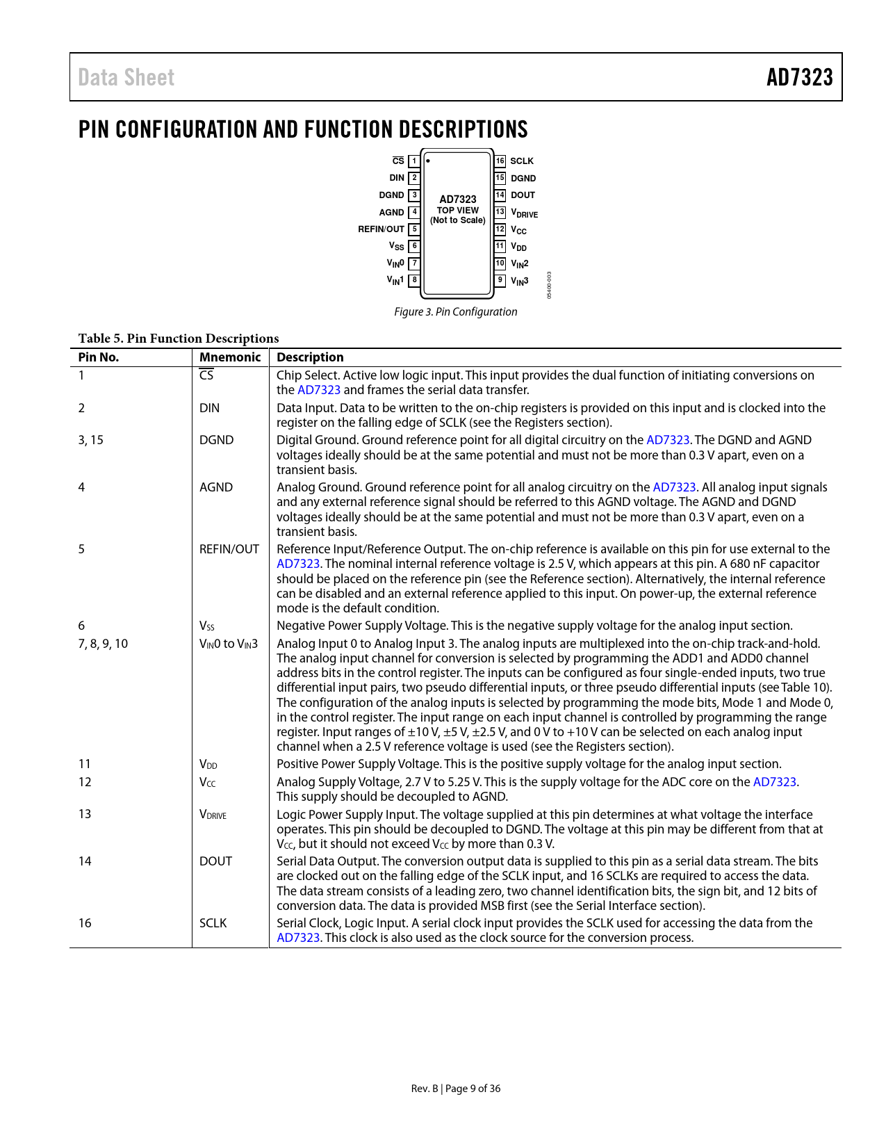 Data Sheet AD7323 PIN CONFIGURATION AND FUNCTION DESCRIPTIONS 16 SCLK DIN DGND DOUT AGND TOP VIEW VDRIVE (Not to Scale) REFIN/OUT