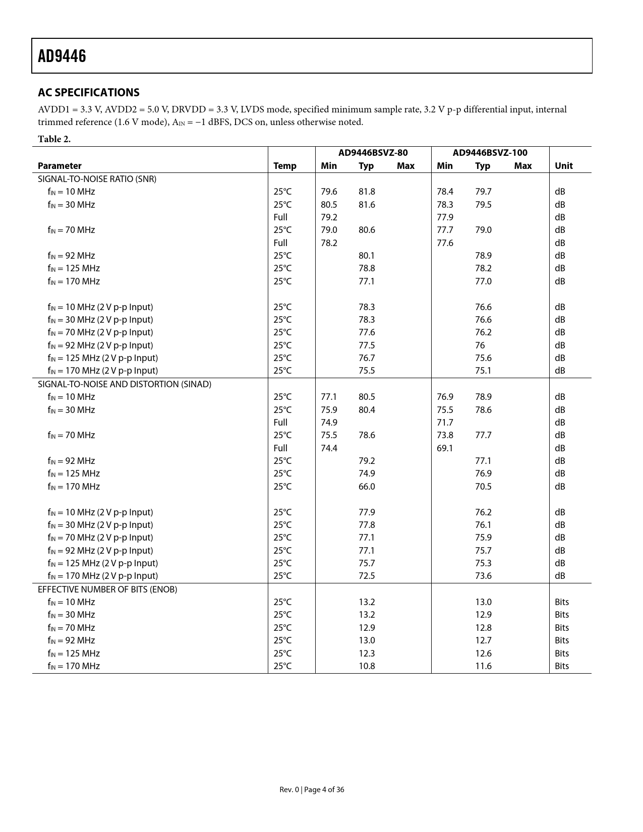 AD9446 AC SPECIFICATIONS Table 2 AD9446BSVZ-80 AD9446BSVZ-100 Parameter Temp Min Typ Max Min Typ Max Unit