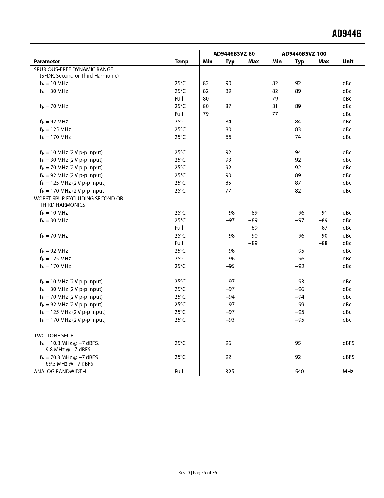 AD9446. AD9446BSVZ-80. AD9446BSVZ-100. Parameter. Temp. Min Typ Max Min Typ Max Unit
