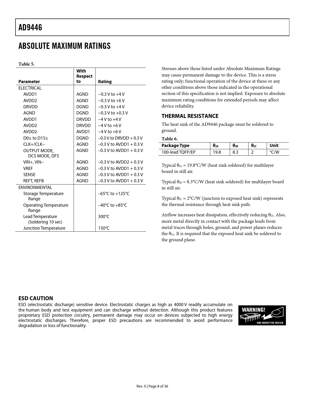AD9446 ABSOLUTE MAXIMUM RATINGS Table 5 With Respect Parameter Rating THERMAL RESISTANCE Table 6 Package Type θJA θJB θJC Unit