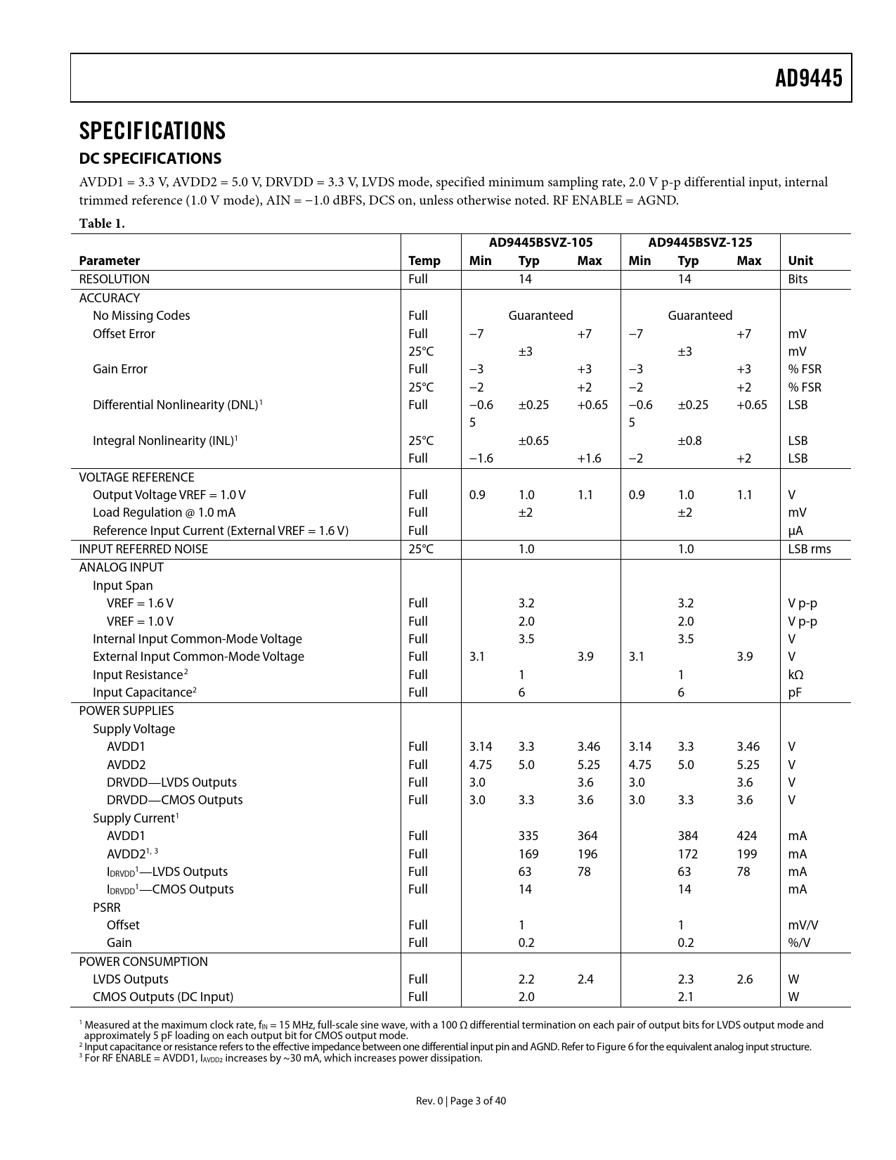 AD9445 SPECIFICATIONS DC SPECIFICATIONS Table 1 AD9445BSVZ-105 AD9445BSVZ-125 Parameter Temp Min Typ Max Min Typ Max Unit