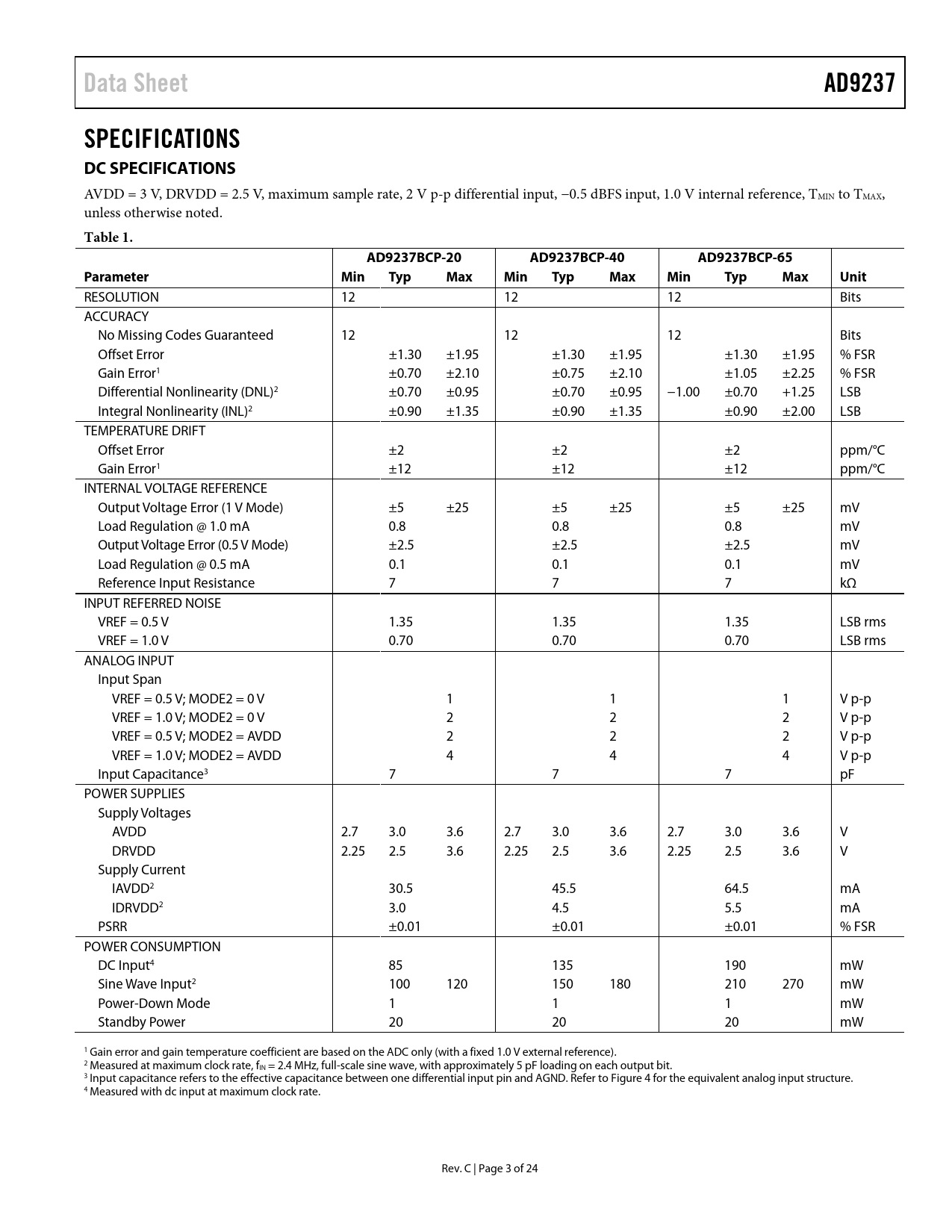 Data Sheet AD9237 SPECIFICATIONS DC SPECIFICATIONS Table 1 AD9237BCP-20 AD9237BCP-40 AD9237BCP-65 Parameter Min Typ Max Unit