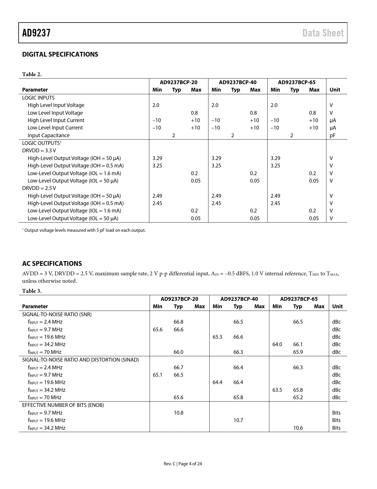AD9237. Data Sheet. DIGITAL SPECIFICATIONS. Table 2. AD9237BCP-20. AD9237BCP-40. AD9237BCP-65. Parameter. Min. Typ. Max. Unit