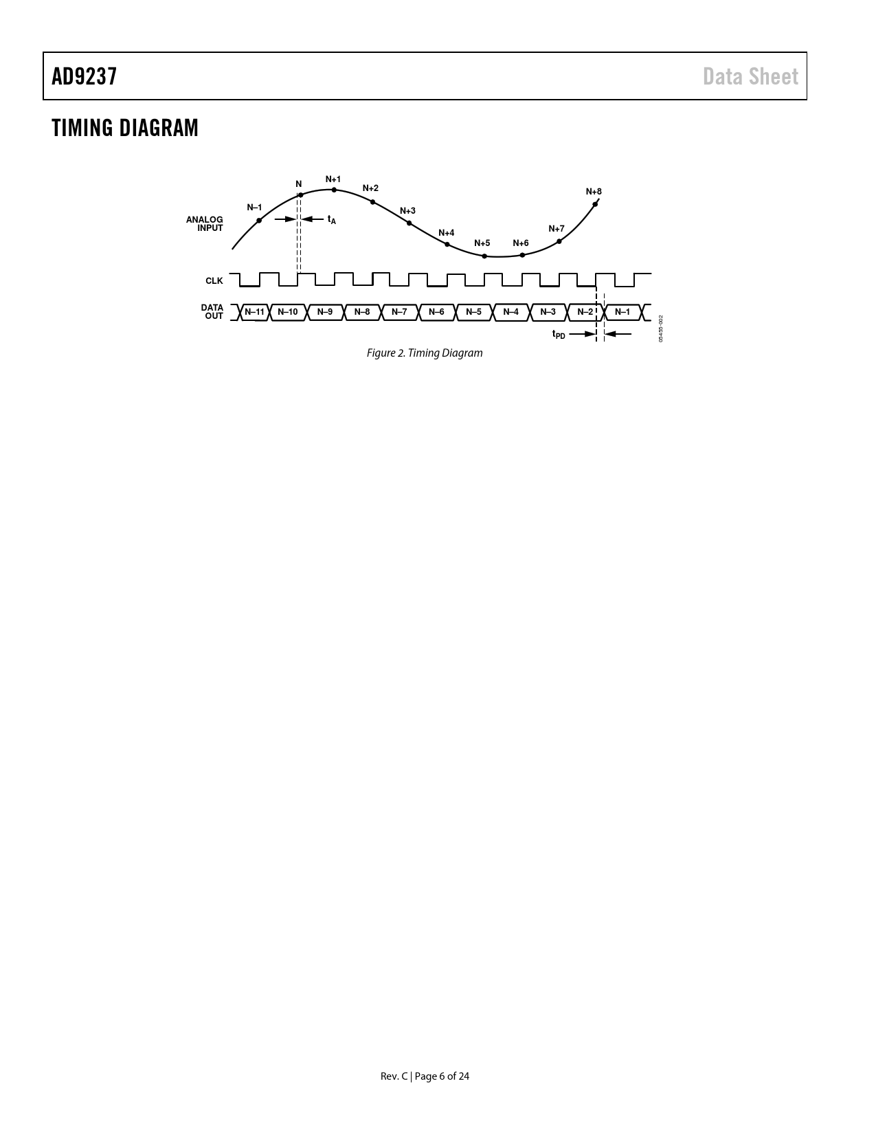 AD9237. Data Sheet. TIMING DIAGRAM. N+1. N+2. N+8. N–1. N+3. ANALOG. INPUT. N+7. N+4. N+5. N+6. CLK. DATA. N–11. N–10. N–9. N–8. N–7. N–6. N–5. N–4. N–3. N–2. OUT. tPD