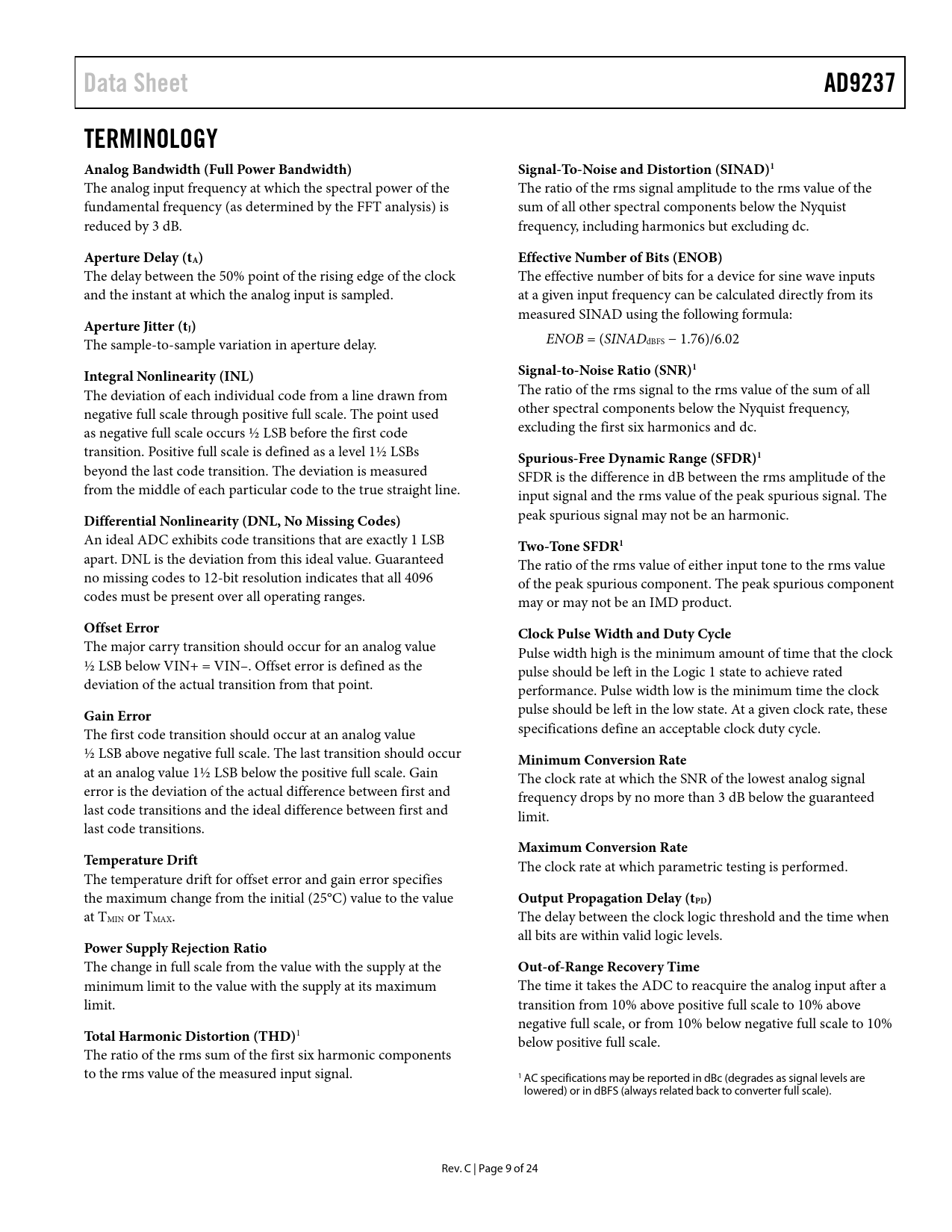 Data SheetAD9237TERMINOLOGY Analog Bandwidth (Full Power Bandwidth)Signal-To-Noise and Distortion (SINAD)1 The analog input frequency at which the spectral power of the The ratio of the rms signal amplitude to the rms value of the fundamental frequency (as determined by the FFT analysis) is sum of all other spectral components below the Nyquist reduced by 3 dB. frequency, including harmonics but excluding dc. Aperture Delay (tA)Effective Number of Bits (ENOB) The delay between the 50% point of the rising edge of the clock The effective number of bits for a device for sine wave inputs and the instant at which the analog input is sampled. at a given input frequency can be calculated directly from its measured SINAD using the following formula: Aperture Jitter (tJ) The sample-to-sample variation in aperture delay. ENOB = (SINADdBFS − 1.76)/6.02 Integral Nonlinearity (INL)Signal-to-Noise Ratio (SNR)1 The deviation of each individual code from a line drawn from The ratio of the rms signal to the rms value of the sum of all negative full scale through positive full scale. The point used other spectral components below the Nyquist frequency, as negative full scale occurs ½ LSB before the first code excluding the first six harmonics and dc. transition. Positive full scale is defined as a level 1½ LSBs Spurious-Free Dynamic Range (SFDR)1 beyond the last code transition. The deviation is measured SFDR is the difference in dB between the rms amplitude of the from the middle of each particular code to the true straight line. input signal and the rms value of the peak spurious signal. The Differential Nonlinearity (DNL, No Missing Codes) peak spurious signal may not be an harmonic. An ideal ADC exhibits code transitions that are exactly 1 LSB Two-Tone SFDR1 apart. DNL is the deviation from this ideal value. Guaranteed The ratio of the rms value of either input tone to the rms value no missing codes to 12-bit resolution indicates that al 4096 of the peak spurious component. The peak spurious component codes must be present over al operating ranges. may or may not be an IMD product. Offset ErrorClock Pulse Width and Duty Cycle The major carry transition should occur for an analog value Pulse width high is the minimum amount of time that the clock ½ LSB below VIN+ = VIN–. Offset error is defined as the pulse should be left in the Logic 1 state to achieve rated deviation of the actual transition from that point. performance. Pulse width low is the minimum time the clock Gain Error pulse should be left in the low state. At a given clock rate, these The first code transition should occur at an analog value specifications define an acceptable clock duty cycle. ½ LSB above negative full scale. The last transition should occur Minimum Conversion Rate at an analog value 1½ LSB below the positive full scale. Gain The clock rate at which the SNR of the lowest analog signal error is the deviation of the actual difference between first and frequency drops by no more than 3 dB below the guaranteed last code transitions and the ideal difference between first and limit. last code transitions. Maximum Conversion RateTemperature Drift The clock rate at which parametric testing is performed. The temperature drift for offset error and gain error specifies the maximum change from the initial (25°C) value to the value Output Propagation Delay (tPD) at TMIN or TMAX. The delay between the clock logic threshold and the time when all bits are within valid logic levels. Power Supply Rejection Ratio The change in ful scale from the value with the supply at the Out-of-Range Recovery Time minimum limit to the value with the supply at its maximum The time it takes the ADC to reacquire the analog input after a limit. transition from 10% above positive full scale to 10% above negative full scale, or from 10% below negative full scale to 10% Total Harmonic Distortion (THD) 1 below positive full scale. The ratio of the rms sum of the first six harmonic components to the rms value of the measured input signal. 1 AC specifications may be reported in dBc (degrades as signal levels are lowered) or in dBFS (always related back to converter full scale). Rev. C | Page 9 of 24 Document Outline Features Applications Functional Block Diagram General Description Product Highlights Table of Contents Revision History Specifications DC Specifications Digital Specifications AC Specifications Switching Specifications Timing Diagram Absolute Maximum Ratings ESD Caution Pin Configuration and Function Descriptions Terminology Equivalent Circuits Typical Performance Characteristics Applying the AD9237 Theory of Operation Analog Input and Reference Overview Differential Input Configurations Single-Ended Input Configuration Voltage Reference Internal Reference Connection External Reference Operation Clock Input Considerations Power Dissipation, Power Scaling, and Standby Mode Digital Outputs Operational Mode Selection Out of Range (OTR) Digital Output Enable Function (OE) Timing Outline Dimensions Ordering Guide