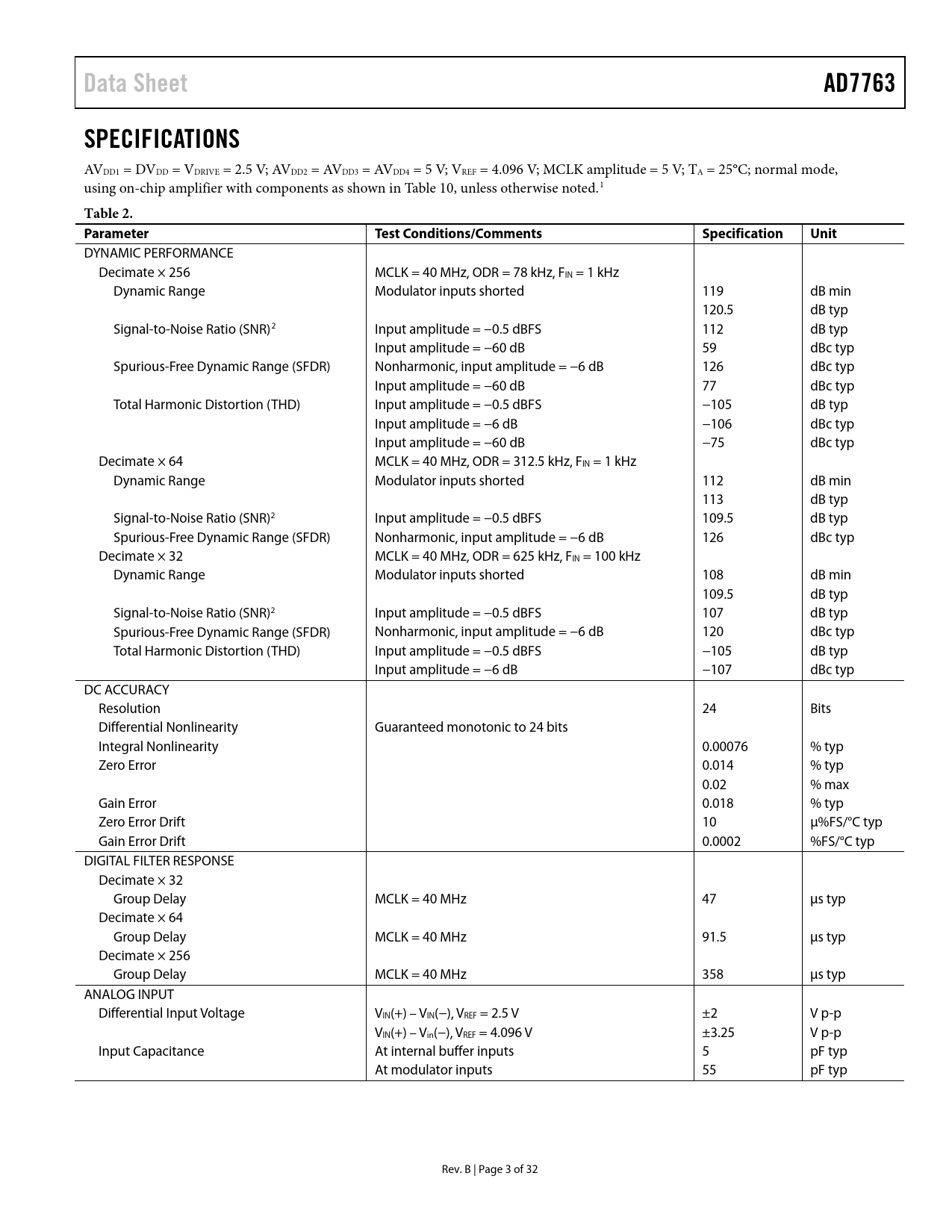 Data Sheet. AD7763. SPECIFICATIONS. Table 2. Parameter. Test Conditions/Comments. Specification. Unit