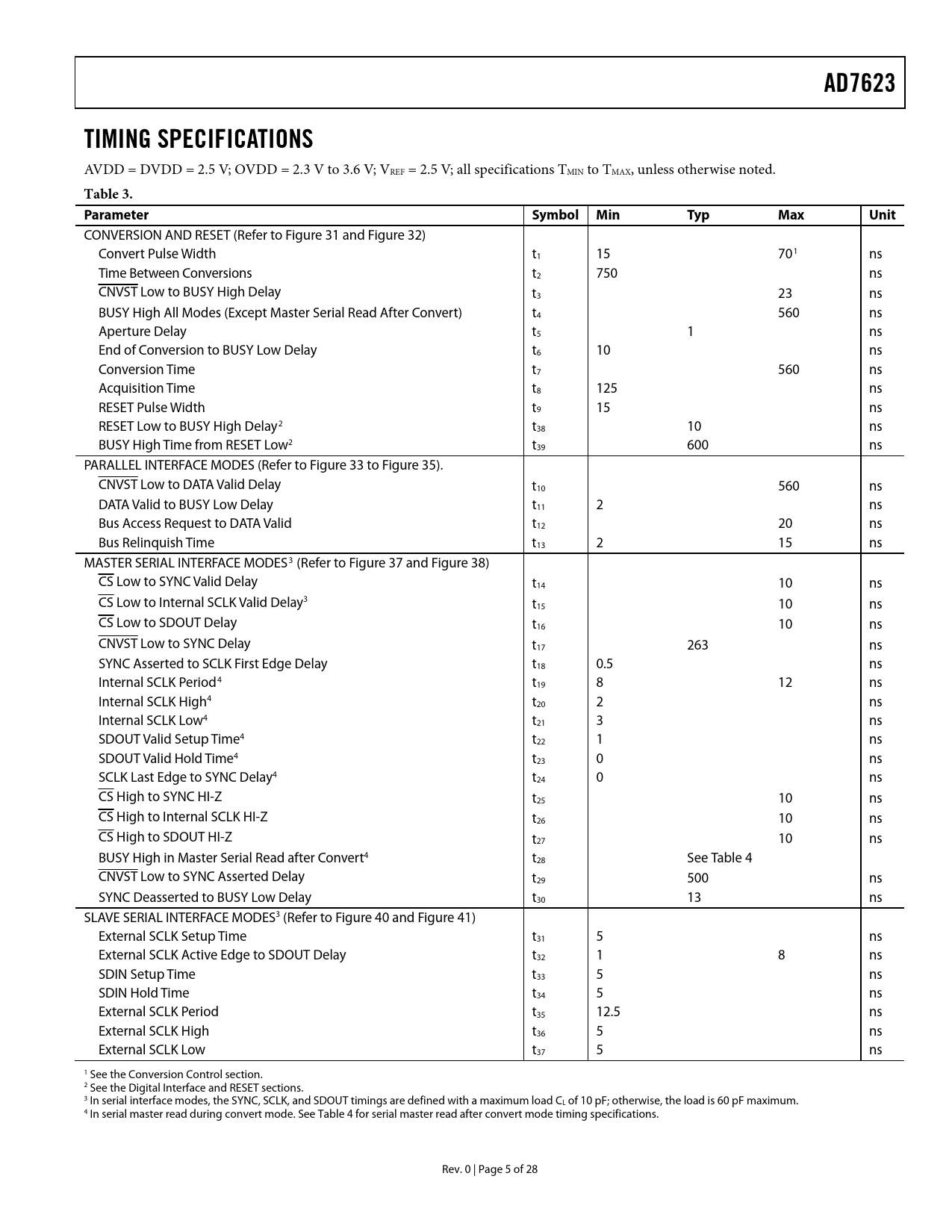 link to page 6 link to page 6 link to page 6 link to page 22 link to page 23 link to page 6 link to page 24 link to page 24 link to page 6 link to page 6 link to page 6 link to page 6 link to page 6 link to page 6 link to page 6 link to page 6 link to page 7 link to page 6 link to page 26 link to page 26 link to page 21 link to page 22 link to page 22 link to page 7 link to page 21 link to page 22 AD7623TIMING SPECIFICATIONS AVDD = DVDD = 2.5 V; OVDD = 2.3 V to 3.6 V; VREF = 2.5 V; all specifications TMIN to TMAX, unless otherwise noted. Table 3. Parameter SymbolMinTypMaxUnit CONVERSION AND RESET (Refer to Figure 31 and Figure 32) Convert Pulse Width t1 15 701 ns Time Between Conversions t2 750 ns CNVST Low to BUSY High Delay t3 23 ns BUSY High All Modes (Except Master Serial Read After Convert) t4 560 ns Aperture Delay t5 1 ns End of Conversion to BUSY Low Delay t6 10 ns Conversion Time t7 560 ns Acquisition Time t8 125 ns RESET Pulse Width t9 15 ns RESET Low to BUSY High Delay2 t38 10 ns BUSY High Time from RESET Low2 t39 600 ns PARALLEL INTERFACE MODES (Refer to Figure 33 to Figure 35). CNVST Low to DATA Valid Delay t10 560 ns DATA Valid to BUSY Low Delay t11 2 ns Bus Access Request to DATA Valid t12 20 ns Bus Relinquish Time t13 2 15 ns MASTER SERIAL INTERFACE MODES3 (Refer to Figure 37 and Figure 38) CS Low to SYNC Valid Delay t14 10 ns CS Low to Internal SCLK Valid Delay3 t15 10 ns CS Low to SDOUT Delay t16 10 ns CNVST Low to SYNC Delay t17 263 ns SYNC Asserted to SCLK First Edge Delay t18 0.5 ns Internal SCLK Period4 t19 8 12 ns Internal SCLK High4 t20 2 ns Internal SCLK Low4 t21 3 ns SDOUT Valid Setup Time4 t22 1 ns SDOUT Valid Hold Time4 t23 0 ns SCLK Last Edge to SYNC Delay4 t24 0 ns CS High to SYNC HI-Z t25 10 ns CS High to Internal SCLK HI-Z t26 10 ns CS High to SDOUT HI-Z t27 10 ns BUSY High in Master Serial Read after Convert4 t28 See Table 4 CNVST Low to SYNC Asserted Delay t29 500 ns SYNC Deasserted to BUSY Low Delay t30 13 ns SLAVE SERIAL INTERFACE MODES3 (Refer to Figure 40 and Figure 41) External SCLK Setup Time t31 5 ns External SCLK Active Edge to SDOUT Delay t32 1 8 ns SDIN Setup Time t33 5 ns SDIN Hold Time t34 5 ns External SCLK Period t35 12.5 ns External SCLK High t36 5 ns External SCLK Low t37 5 ns 1 See the Conversion Control section. 2 See the Digital Interface and RESET sections. 3 In serial interface modes, the SYNC, SCLK, and SDOUT timings are defined with a maximum load CL of 10 pF; otherwise, the load is 60 pF maximum. 4 In serial master read during convert mode. See Table 4 for serial master read after convert mode timing specifications. Rev. 0 | Page 5 of 28 Document Outline FEATURES APPLICATIONS GENERAL DESCRIPTION FUNCTIONAL BLOCK DIAGRAM PRODUCT HIGHLIGHTS SPECIFICATIONS TIMING SPECIFICATIONS SERIAL CLOCK TIMING SPECIFICATIONS ABSOLUTE MAXIMUM RATINGS ESD CAUTION PIN CONFIGURATION AND FUNCTION DESCRIPTIONS TERMINOLOGY TYPICAL PERFORMANCE CHARACTERISTICS THEORY OF OPERATION CIRCUIT INFORMATION CONVERTER OPERATION TRANSFER FUNCTIONS TYPICAL CONNECTION DIAGRAM ANALOG INPUTS DRIVER AMPLIFIER CHOICE Single-to-Differential Driver VOLTAGE REFERENCE INPUT Internal Reference (PDBUF = Low, PDREF = Low) External 1.2 V Reference and Internal Buffer (PDREF = High, PBBUF = Low) External Reference (PDBUF = High, PRBUF = High) Reference Decoupling Temperature Sensor POWER SUPPLY Power Sequencing Power-Up POWER DISSIPATION VS. THROUGHPUT CONVERSION CONTROL INTERFACES DIGITAL INTERFACE RESET PARALLEL INTERFACE Master Parallel Interface Slave Parallel Interface 8-Bit Interface (Master or Slave) SERIAL INTERFACE MASTER SERIAL INTERFACE Internal Clock SLAVE SERIAL INTERFACE External Clock External Discontinuous Clock Data Read After Conversion External Clock Data Read During Previous Conversion MICROPROCESSOR INTERFACING SPI Interface (ADSP-219x) APPLICATION LAYOUT EVALUATING THE AD7623 PERFORMANCE OUTLINE DIMENSIONS ORDERING GUIDE