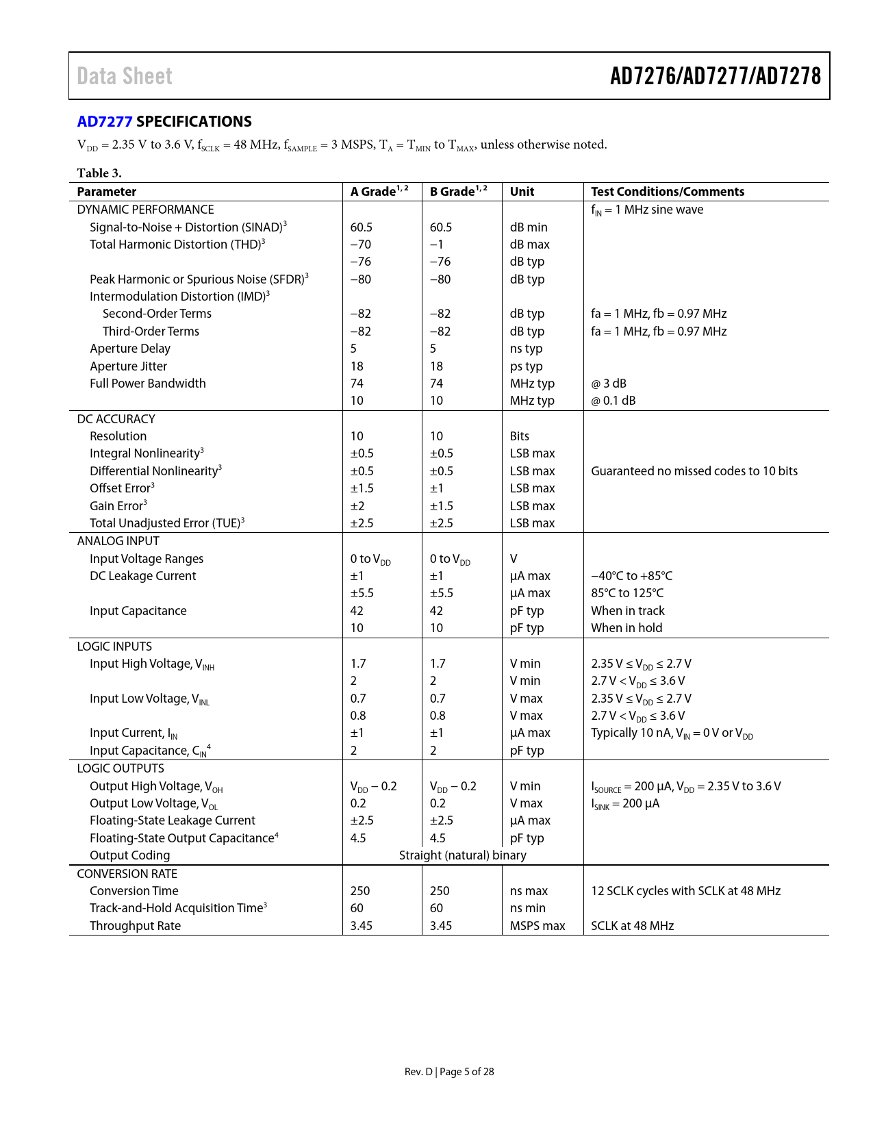 Seiten / Seite28 / 5 — Data Sheet. AD7276/AD7277/AD7278. AD7277. SPECIFICATIONS. Table 3. …
