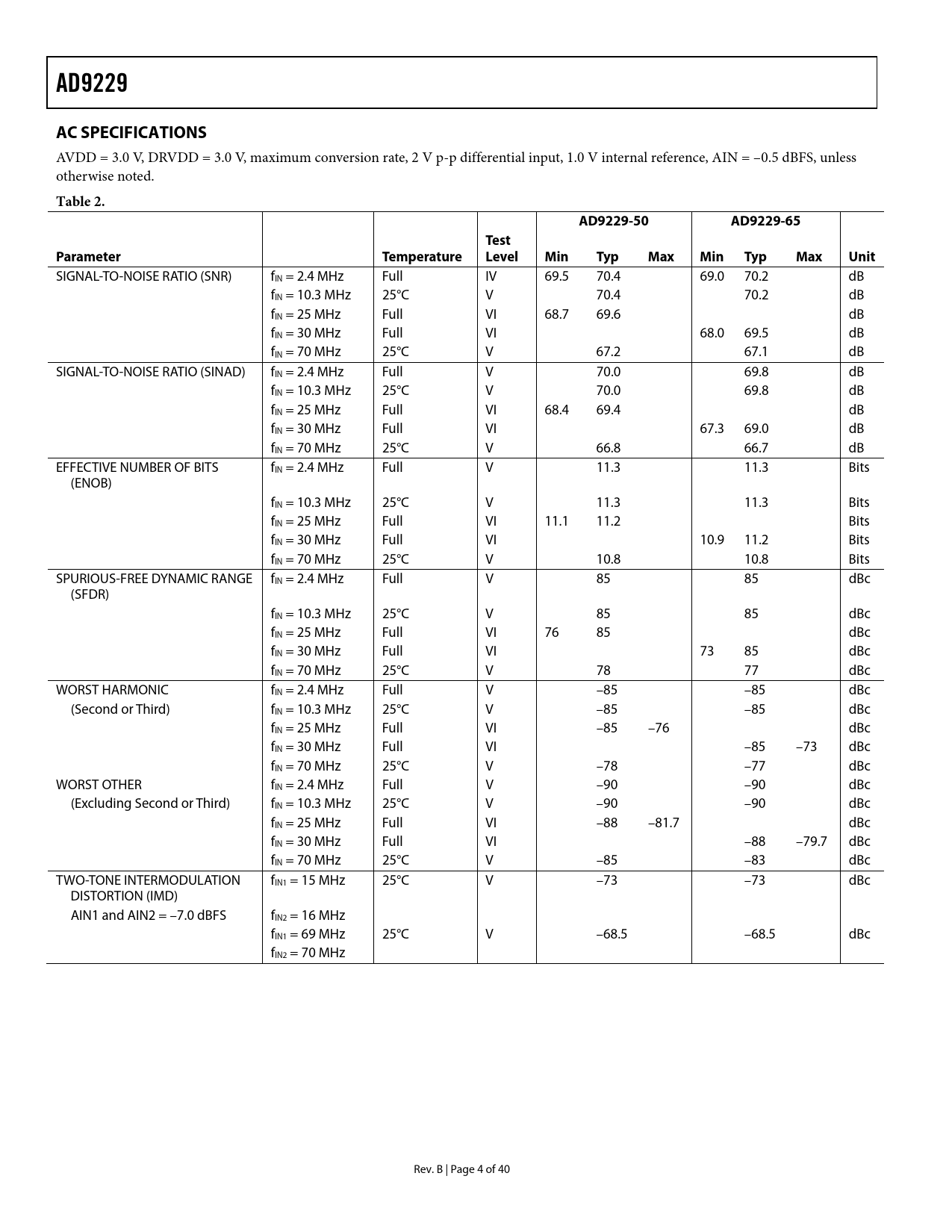 AD9229. AC SPECIFICATIONS. Table 2. AD9229-50. AD9229-65. Test. Parameter. Temperature. Level. Min Typ Max Min. Typ Max Unit