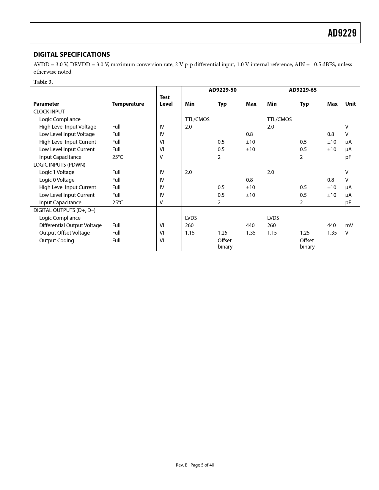 AD9229DIGITAL SPECIFICATIONS AVDD = 3.0 V, DRVDD = 3.0 V, maximum conversion rate, 2 V p-p differential input, 1.0 V internal reference, AIN = –0.5 dBFS, unless otherwise noted. Table 3.AD9229-50AD9229-65TestParameter TemperatureLevelMin TypMaxMin TypMaxUnit CLOCK INPUT Logic Compliance TTL/CMOS TTL/CMOS High Level Input Voltage Full IV 2.0 2.0 V Low Level Input Voltage Full IV 0.8 0.8 V High Level Input Current Full VI 0.5 ±10 0.5 ±10 μA Low Level Input Current Full VI 0.5 ±10 0.5 ±10 μA Input Capacitance 25°C V 2 2 pF LOGIC INPUTS (PDWN) Logic 1 Voltage Full IV 2.0 2.0 V Logic 0 Voltage Full IV 0.8 0.8 V High Level Input Current Full IV 0.5 ±10 0.5 ±10 μA Low Level Input Current Full IV 0.5 ±10 0.5 ±10 μA Input Capacitance 25°C V 2 2 pF DIGITAL OUTPUTS (D+, D–) Logic Compliance LVDS LVDS Differential Output Voltage Full VI 260 440 260 440 mV Output Offset Voltage Full VI 1.15 1.25 1.35 1.15 1.25 1.35 V Output Coding Full VI Offset Offset binary binary Rev. B | Page 5 of 40 Document Outline FEATURES APPLICATIONS FUNCTIONAL BLOCK DIAGRAM GENERAL DESCRIPTION PRODUCT HIGHLIGHTS REVISION HISTORY SPECIFICATIONS AC SPECIFICATIONS DIGITAL SPECIFICATIONS SWITCHING SPECIFICATIONS TIMING DIAGRAM ABSOLUTE MAXIMUM RATINGS EXPLANATION OF TEST LEVELS ESD CAUTION PIN CONFIGURATION AND FUNCTION DESCRIPTIONS EQUIVALENT CIRCUITS TYPICAL PERFORMANCE CHARACTERISTICS TERMINOLOGY THEORY OF OPERATION ANALOG INPUT CONSIDERATIONS Differential Input Configurations Single-Ended Input Configuration CLOCK INPUT CONSIDERATIONS Power Dissipation and Power-Down Mode Digital Outputs Timing DTP Pin Voltage Reference Internal Reference Connection External Reference Operation Power and Ground Recommendations Exposed Paddle Thermal Heat Slug Recommendations EVALUATION BOARD POWER SUPPLIES INPUT SIGNALS OUTPUT SIGNALS DEFAULT OPERATION AND JUMPER SELECTION SETTINGS ALTERNATE ANALOG INPUT DRIVE CONFIGURATION OUTLINE DIMENSIONS ORDERING GUIDE