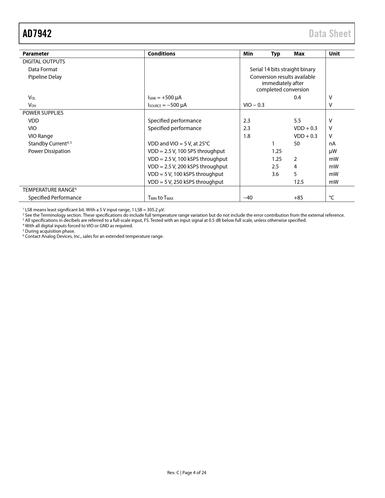 Seiten / Seite25 / 5 — AD7942. Data Sheet. Parameter Conditions. Min. Typ. Max. Unit