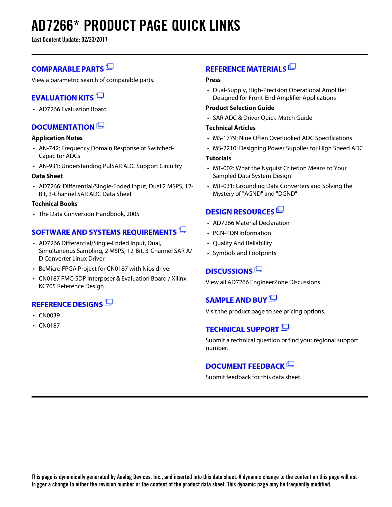 AD7266* PRODUCT PAGE QUICK LINKS Last Content Update: 02/23/2017COMPARABLE PARTSREFERENCE MATERIALS View a parametric search of comparable parts. Press • Dual-Supply, High-Precision Operational Amplifier EVALUATION KITS Designed for Front-End Amplifier Applications • AD7266 Evaluation Board Product Selection Guide • SAR ADC & Driver Quick-Match Guide DOCUMENTATIONTechnical ArticlesApplication Notes • MS-1779: Nine Often Overlooked ADC Specifications • AN-742: Frequency Domain Response of Switched- • MS-2210: Designing Power Supplies for High Speed ADC Capacitor ADCs Tutorials • AN-931: Understanding PulSAR ADC Support Circuitry • MT-002: What the Nyquist Criterion Means to Your Data Sheet Sampled Data System Design • AD7266: Differential/Single-Ended Input, Dual 2 MSPS, 12- • MT-031: Grounding Data Converters and Solving the Bit, 3-Channel SAR ADC Data Sheet Mystery of "AGND" and "DGND" Technical Books • The Data Conversion Handbook, 2005 DESIGN RESOURCES • AD7266 Material Declaration SOFTWARE AND SYSTEMS REQUIREMENTS • PCN-PDN Information • AD7266 Differential/Single-Ended Input, Dual, • Quality And Reliability Simultaneous Sampling, 2 MSPS, 12-Bit, 3-Channel SAR A/ • Symbols and Footprints D Converter Linux Driver • BeMicro FPGA Project for CN0187 with Nios driver DISCUSSIONS • CN0187 FMC-SDP Interposer & Evaluation Board / Xilinx View all AD7266 EngineerZone Discussions. KC705 Reference Design SAMPLE AND BUYREFERENCE DESIGNS Visit the product page to see pricing options. • CN0039 • CN0187 TECHNICAL SUPPORT Submit a technical question or find your regional support number. DOCUMENT FEEDBACK Submit feedback for this data sheet. This page is dynamically generated by Analog Devices, Inc., and inserted into this data sheet. A dynamic change to the content on this page will not trigger a change to either the revision number or the content of the product data sheet. This dynamic page may be frequently modified. Document Outline FEATURES GENERAL DESCRIPTION FUNCTIONAL BLOCK DIAGRAM PRODUCT HIGHLIGHTS TABLE OF CONTENTS REVISION HISTORY SPECIFICATIONS TIMING SPECIFICATIONS ABSOLUTE MAXIMUM RATINGS ESD CAUTION PIN CONFIGURATION AND FUNCTION DESCRIPTIONS TYPICAL PERFORMANCE CHARACTERISTICS TERMINOLOGY THEORY OF OPERATION CIRCUIT INFORMATION CONVERTER OPERATION ANALOG INPUT STRUCTURE ANALOG INPUTS Single-Ended Mode Differential Mode Driving Differential Inputs Using an Op Amp Pair Pseudo Differential Mode ANALOG INPUT SELECTION OUTPUT CODING TRANSFER FUNCTIONS DIGITAL INPUTS VDRIVE MODES OF OPERATION NORMAL MODE PARTIAL POWER-DOWN MODE FULL POWER-DOWN MODE POWER-UP TIMES POWER vs. THROUGHPUT RATE SERIAL INTERFACE MICROPROCESSOR INTERFACING AD7266 TO ADSP-218x AD7266 TO ADSP-BF53x AD7266 TO TMS320C541 AD7266 TO DSP563xx APPLICATION HINTS GROUNDING AND LAYOUT PCB DESIGN GUIDELINES FOR LFCSP EVALUATING THE AD7266 PERFORMANCE OUTLINE DIMENSIONS ORDERING GUIDE