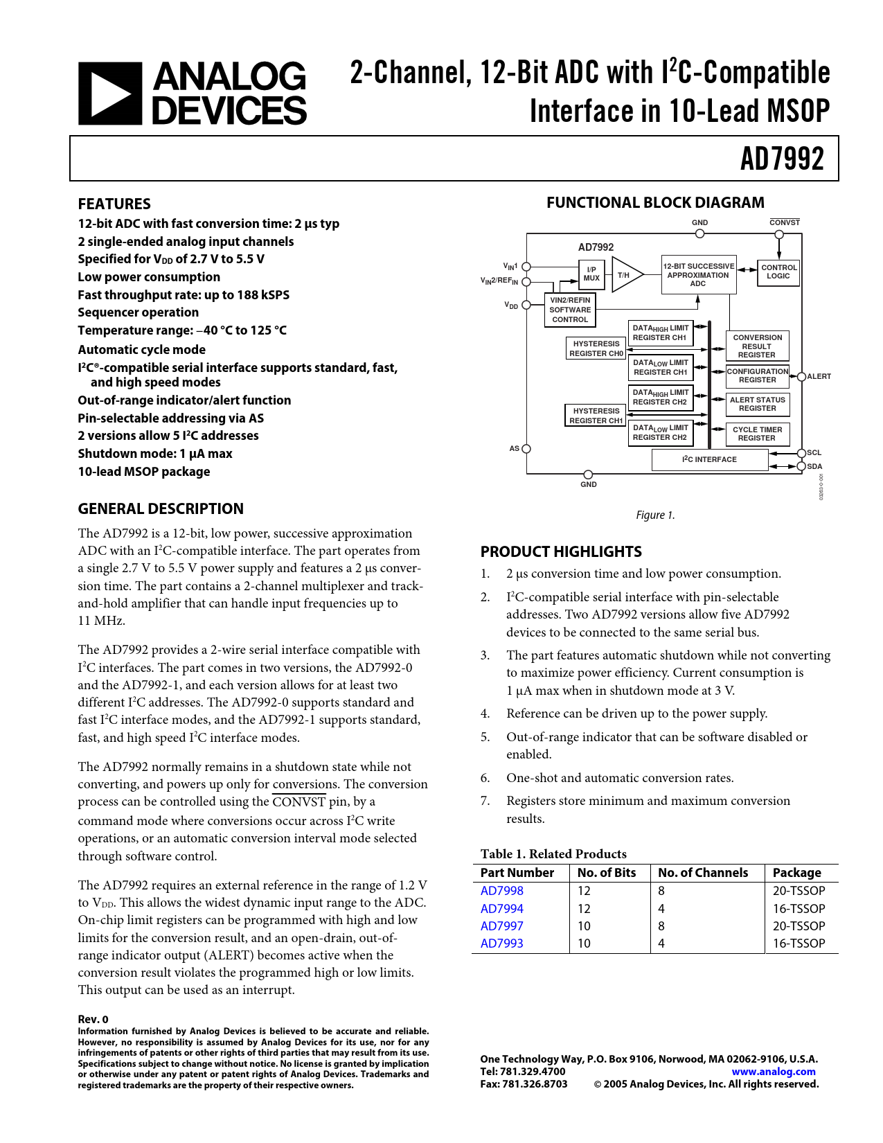 2-Channel, 12-Bit ADC with I2C-Compatible. Interface in 10-Lead MSOP. AD7992. FEATURES. FUNCTIONAL BLOCK DIAGRAM