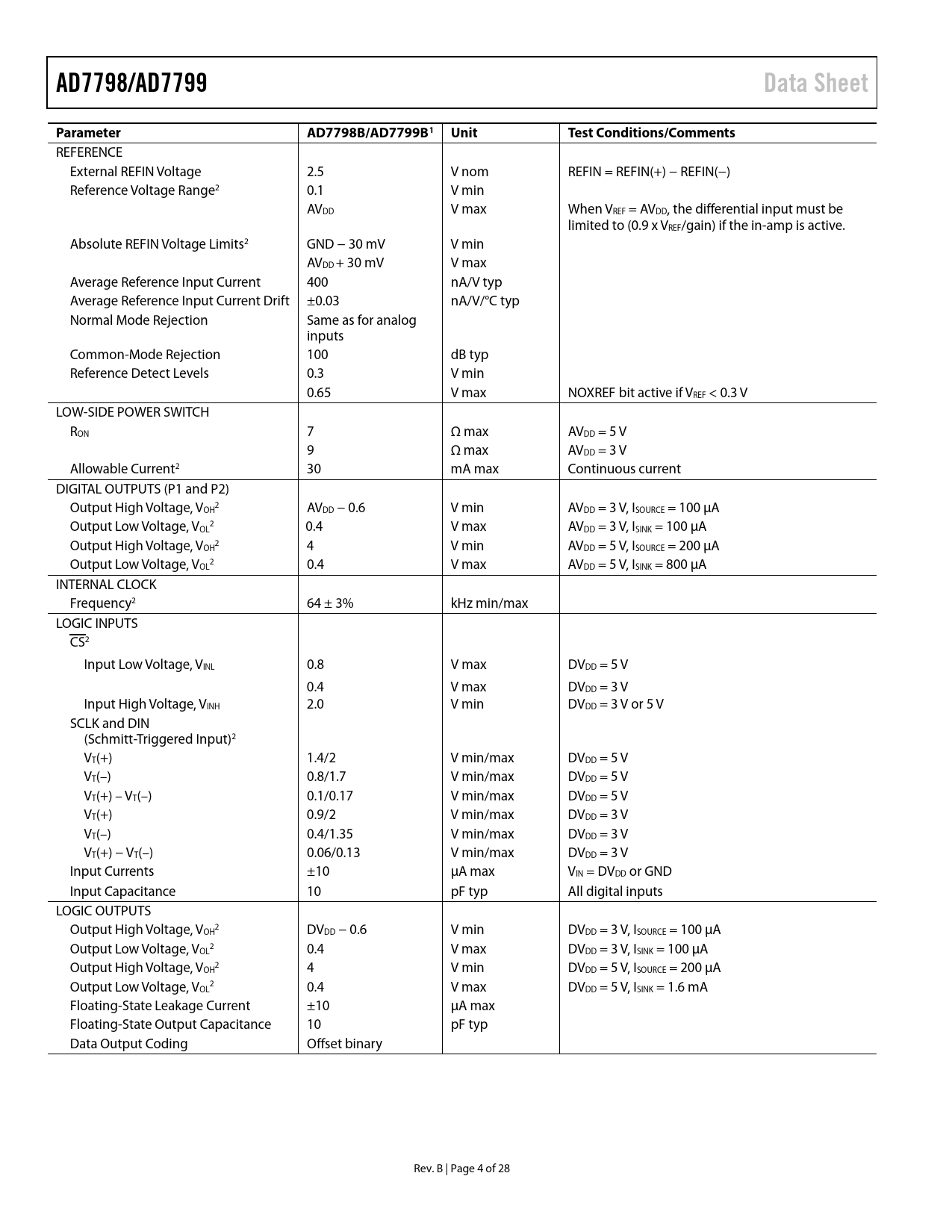 link to page 5 link to page 5 link to page 5 link to page 5 link to page 5 link to page 5 link to page 5 link to page 5 link to page 5 link to page 5 link to page 5 link to page 5 link to page 5 link to page 5 link to page 5 AD7798/AD7799Data SheetParameterAD7798B/AD7799B1UnitTest Conditions/Comments REFERENCE External REFIN Voltage 2.5 V nom REFIN = REFIN(+) − REFIN(−) Reference Voltage Range2 0.1 V min AVDD V max When VREF = AVDD, the differential input must be limited to (0.9 x VREF/gain) if the in-amp is active. Absolute REFIN Voltage Limits2 GND − 30 mV V min AVDD + 30 mV V max Average Reference Input Current 400 nA/V typ Average Reference Input Current Drift ±0.03 nA/V/°C typ Normal Mode Rejection Same as for analog inputs Common-Mode Rejection 100 dB typ Reference Detect Levels 0.3 V min 0.65 V max NOXREF bit active if VREF < 0.3 V LOW-SIDE POWER SWITCH RON 7 Ω max AVDD = 5 V 9 Ω max AVDD = 3 V Allowable Current2 30 mA max Continuous current DIGITAL OUTPUTS (P1 and P2) Output High Voltage, V 2 OH AVDD − 0.6 V min AVDD = 3 V, ISOURCE = 100 µA Output Low Voltage, V 2 OL 0.4 V max AVDD = 3 V, ISINK = 100 µA Output High Voltage, V 2 OH 4 V min AVDD = 5 V, ISOURCE = 200 µA Output Low Voltage, V 2 OL 0.4 V max AVDD = 5 V, ISINK = 800 µA INTERNAL CLOCK Frequency2 64 ± 3% kHz min/max LOGIC INPUTS CS2 Input Low Voltage, VINL 0.8 V max DVDD = 5 V 0.4 V max DVDD = 3 V Input High Voltage, VINH 2.0 V min DVDD = 3 V or 5 V SCLK and DIN (Schmitt-Triggered Input)2 VT(+) 1.4/2 V min/max DVDD = 5 V VT(–) 0.8/1.7 V min/max DVDD = 5 V VT(+) – VT(–) 0.1/0.17 V min/max DVDD = 5 V VT(+) 0.9/2 V min/max DVDD = 3 V VT(–) 0.4/1.35 V min/max DVDD = 3 V VT(+) − VT(–) 0.06/0.13 V min/max DVDD = 3 V Input Currents ±10 µA max VIN = DVDD or GND Input Capacitance 10 pF typ All digital inputs LOGIC OUTPUTS Output High Voltage, V 2 OH DVDD − 0.6 V min DVDD = 3 V, ISOURCE = 100 µA Output Low Voltage, V 2 OL 0.4 V max DVDD = 3 V, ISINK = 100 µA Output High Voltage, V 2 OH 4 V min DVDD = 5 V, ISOURCE = 200 µA Output Low Voltage, V 2 OL 0.4 V max DVDD = 5 V, ISINK = 1.6 mA Floating-State Leakage Current ±10 µA max Floating-State Output Capacitance 10 pF typ Data Output Coding Offset binary Rev. B | Page 4 of 28 Document Outline Features Interface Applications Functional Block Diagram General Description Revision History Specifications Timing Characteristics Absolute Maximum Ratings ESD Caution Pin Configuration and Function Descriptions Output Noise and Resolution Specifications AD7798 AD7799 Typical Performance Characteristics On-Chip Registers Communication Register RS2, RS1, RS0 = 0, 0, 0 Status Register RS2, RS1, RS0 = 0, 0, 0; Power-On/Reset = 0x80 (AD7798)/0x88 (AD7799) Mode Register RS2, RS1, RS0 = 0, 0, 1; Power-On/Reset = 0x000A Configuration Register RS2, RS1, RS0 = 0, 1, 0; Power-On/Reset = 0x0710 Data Register RS2, RS1, RS0 = 0, 1, 1; Power-On/Reset = 0x0000(00) ID Register RS2, RS1, RS0 = 1, 0, 0; Power-On/Reset = 0xX8 (AD7798)/0xX9 (AD7799) IO Register RS2, RS1, RS0 = 1, 0, 1; Power-On/Reset = 0x00 Offset Register RS2, RS1, RS0 = 1, 1, 0; Power-On/Reset = 0x8000(AD7798)/0x800000 (AD7799) Full-Scale Register RS2, RS1, RS0 = 1, 1, 1; Power-On/Reset = 0x5XXX (AD7798)/0x5XXX00 (AD7799) ADC Circuit Information Overview Digital Interface Single-Conversion Mode Continuous-Conversion Mode Continuous Read Circuit Description Analog Input Channel Instrumentation Amplifier Bipolar/Unipolar Configuration Data Output Coding Burnout Currents Reference Reference Detect Reset AVDD Monitor Calibration Grounding and Layout Applications Information Weigh Scales Outline Dimensions Ordering Guide