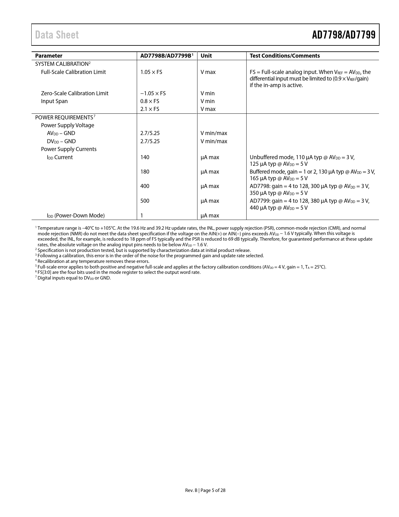 Seiten / Seite28 / 5 — Data Sheet. AD7798/AD7799. Parameter. AD7798B/AD7799B1. Unit. Test …