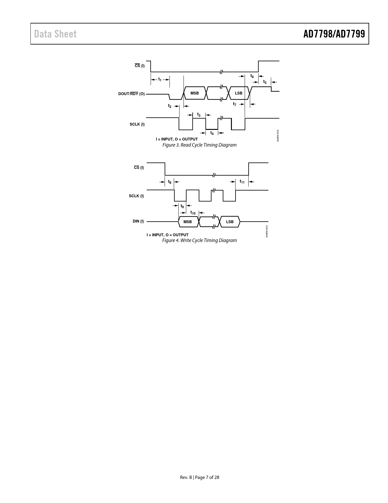 Data Sheet AD7798/AD7799 CS (I) t6 t1 t5 DOUT/RDY (O) MSB LSB t t7 2 t3 SCLK (I) t4 I = INPUT, O = OUTPUT