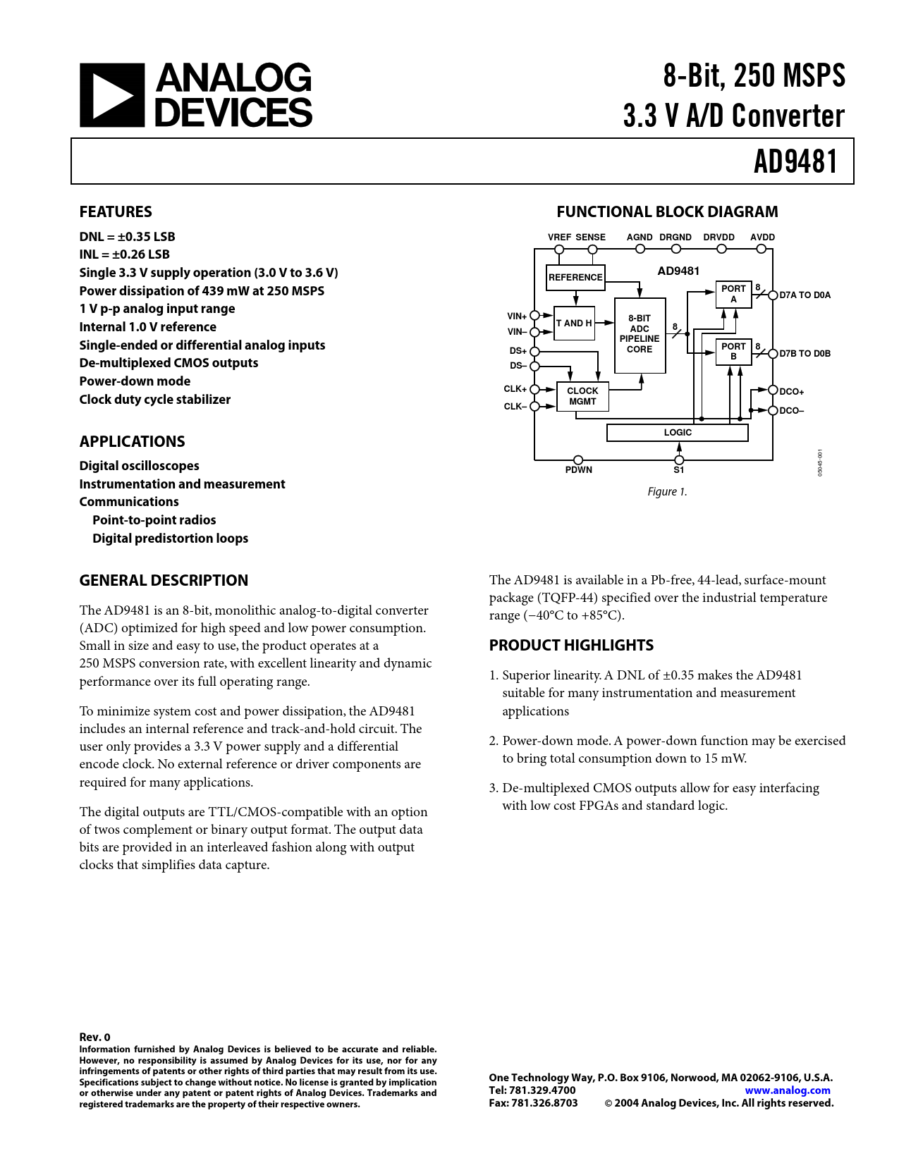 The AD9481 is available in a Pb-free, 44-lead, surface-mount package (TQFP-44) specified over the industrial temperature The AD9481 is an 8-bit, monolithic analog-to-digital converter range (−40°C to +85°C). (ADC) optimized for high speed and low power consumption. Small in size and easy to use, the product operates at a
