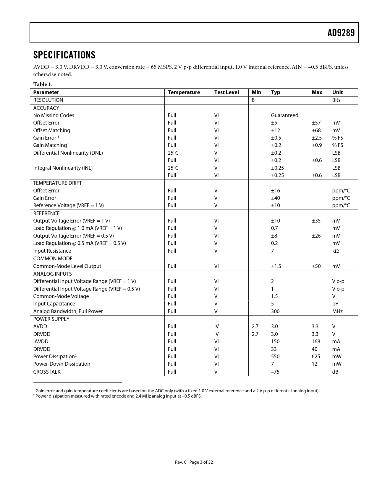 link to page 4 link to page 4 link to page 4 link to page 4 link to page 5 AD9289SPECIFICATIONS AVDD = 3.0 V, DRVDD = 3.0 V, conversion rate = 65 MSPS, 2 V p-p differential input, 1.0 V internal reference, AIN = –0.5 dBFS, unless otherwise noted. Table 1. Parameter TemperatureTestLevelMinTypMaxUnit RESOLUTION 8 Bits ACCURACY No Missing Codes Full VI Guaranteed Offset Error Full VI ±5 ±57 mV Offset Matching Full VI ±12 ±68 mV Gain Error 1 Full VI ±0.5 ±2.5 % FS Gain Matching1 Full VI ±0.2 ±0.9 % FS Differential Nonlinearity (DNL) 25°C V ±0.2 LSB Full VI ±0.2 ±0.6 LSB Integral Nonlinearity (INL) 25°C V ±0.25 LSB Full VI ±0.25 ±0.6 LSB TEMPERATURE DRIFT Offset Error Full V ±16 ppm/°C Gain Error Full V ±40 ppm/°C 1 Reference Voltage (VREF = 1 V) Full V ±10 ppm/°C REFERENCE Output Voltage Error (VREF = 1 V) Full VI ±10 ±35 mV Load Regulation @ 1.0 mA (VREF = 1 V) Full V 0.7 mV Output Voltage Error (VREF = 0.5 V) Full VI ±8 ±26 mV Load Regulation @ 0.5 mA (VREF = 0.5 V) Full V 0.2 mV Input Resistance Full V 7 kΩ COMMON MODE Common-Mode Level Output Full VI ±1.5 ±50 mV ANALOG INPUTS Differential Input Voltage Range (VREF = 1 V) Full VI 2 V p-p Differential Input Voltage Range (VREF = 0.5 V) Full VI 1 V p-p Common-Mode Voltage Full V 1.5 V Input Capacitance Full V 5 pF Analog Bandwidth, Full Power Full V 300 MHz POWER SUPPLY AVDD Full IV 2.7 3.0 3.3 V DRVDD Full IV 2.7 3.0 3.3 V IAVDD Full VI 150 168 mA 2 DRVDD Full VI 33 40 mA 2 Power Dissipation2 Full VI 550 625 mW Power-Down Dissipation Full VI 7 12 mW CROSSTALK Full V –75 dB 1 Gain error and gain temperature coefficients are based on the ADC only (with a fixed 1.0 V external reference and a 2 V p-p differential analog input). 2 Power dissipation measured with rated encode and 2.4 MHz analog input at –0.5 dBFS. Rev. 0 | Page 3 of 32 Document Outline FEATURES PRODUCT DESCRIPTION FUNCTIONAL BLOCK DIAGRAM PRODUCT HIGHLIGHTS SPECIFICATIONS AC SPECIFICATIONS DIGITAL SPECIFICATIONS SWITCHING SPECIFICATIONS TIMING DIAGRAMS ABSOLUTE MAXIMUM RATINGS EXPLANATION OF TEST LEVELS ESD CAUTION PIN CONFIGURATION AND FUNCTION DESCRIPTIONS EQUIVALENT CIRCUITS TYPICAL PERFORMANCE CHARACTERISTICS TERMINOLOGY THEORY OF OPERATION ANALOG INPUT AND REFERENCE OVERVIEW Differential Input Configurations Single-Ended Input Configuration CLOCK INPUT AND CONSIDERATIONS Power Dissipation and Standby Mode Digital Outputs Timing Pin CML Pin DTP Pin Voltage Reference Internal Reference Connection External Reference Operation Power and Ground Recommendations EVALUATION BOARD OUTLINE DIMENSIONS ORDERING GUIDE