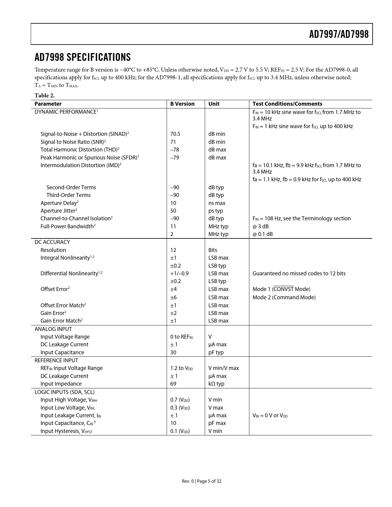 Seiten / Seite32 / 5 — AD7997/AD7998. AD7998 SPECIFICATIONS. Table 2. Parameter. B Version. …