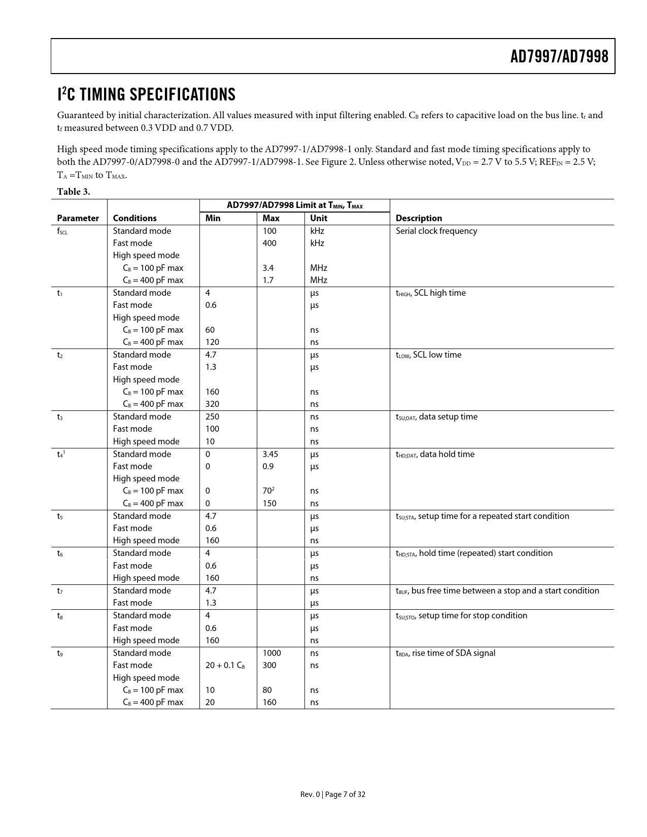 AD7997/AD7998. I2C TIMING SPECIFICATIONS. Table 3. AD7997/AD7998 Limit at TMIN, TMAX. Parameter Conditions. Min. Max. Unit. Description