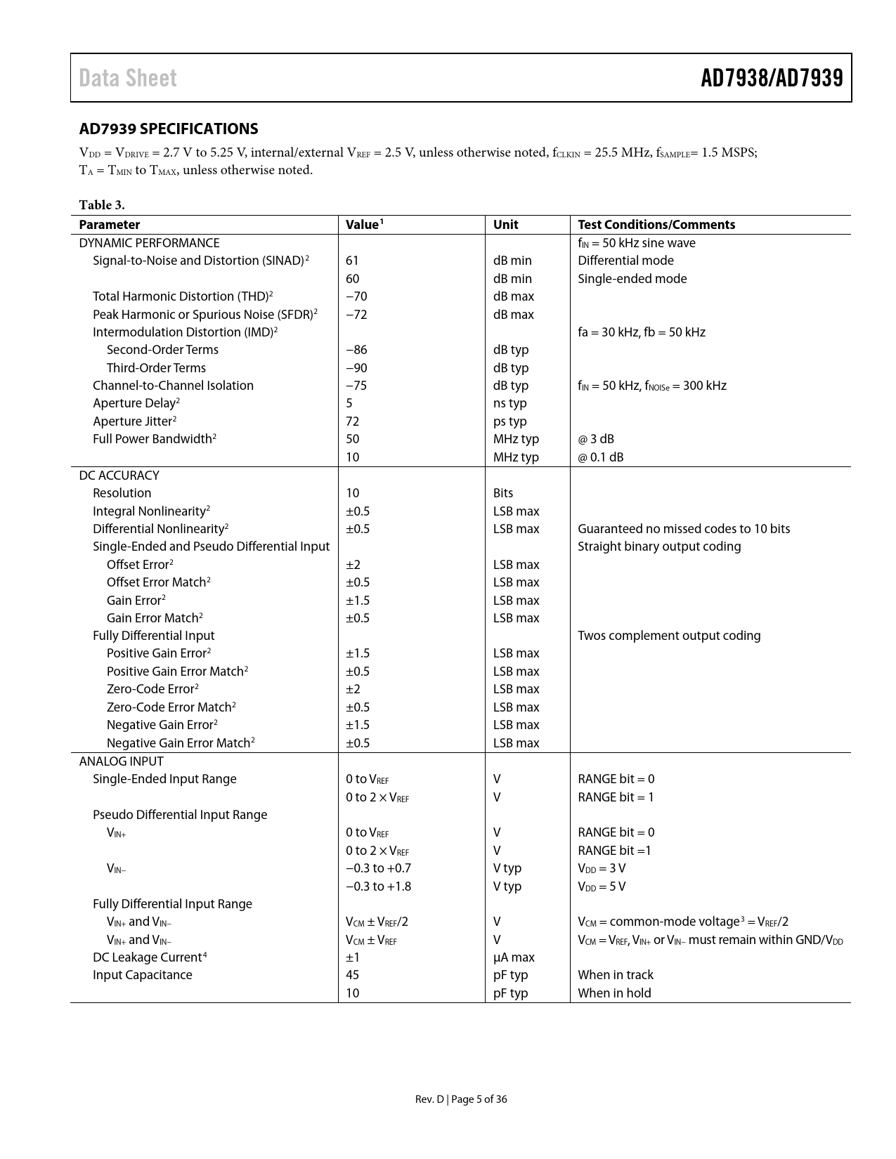 Seiten / Seite36 / 5 — Data Sheet. AD7938/AD7939. AD7939 SPECIFICATIONS. Table 3. Parameter. …