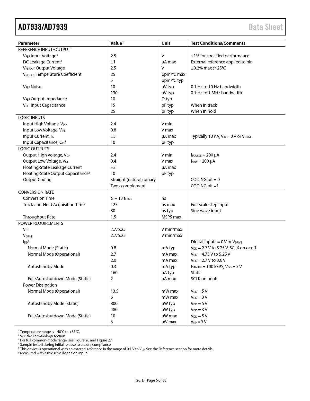 Seiten / Seite36 / 6 — AD7938/AD7939. Data Sheet. Parameter. Value1. Unit. Test …