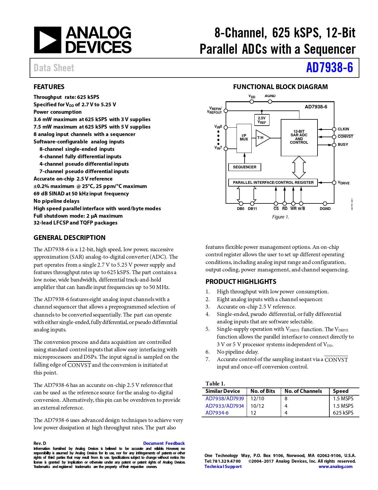 8-Channel, 625 kSPS, 12-Bit. Parallel ADCs with a Sequencer. Data Sheet. AD7938-6. FEATURES. FUNCTIONAL BLOCK DIAGRAM