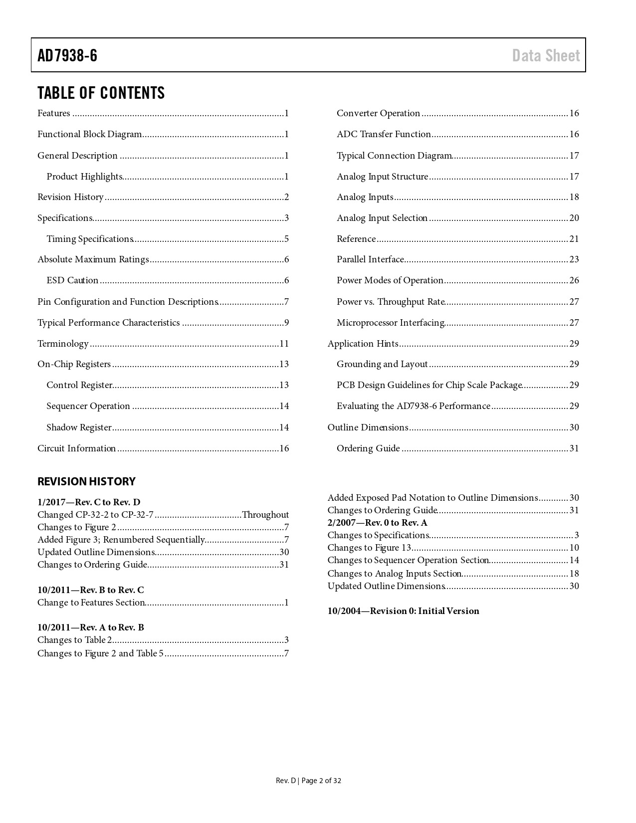 AD7938-6 Data Sheet TABLE OF CONTENTS REVISION HISTORY 1/2017—Rev C to Rev D 2/2007—Rev 0 to Rev A