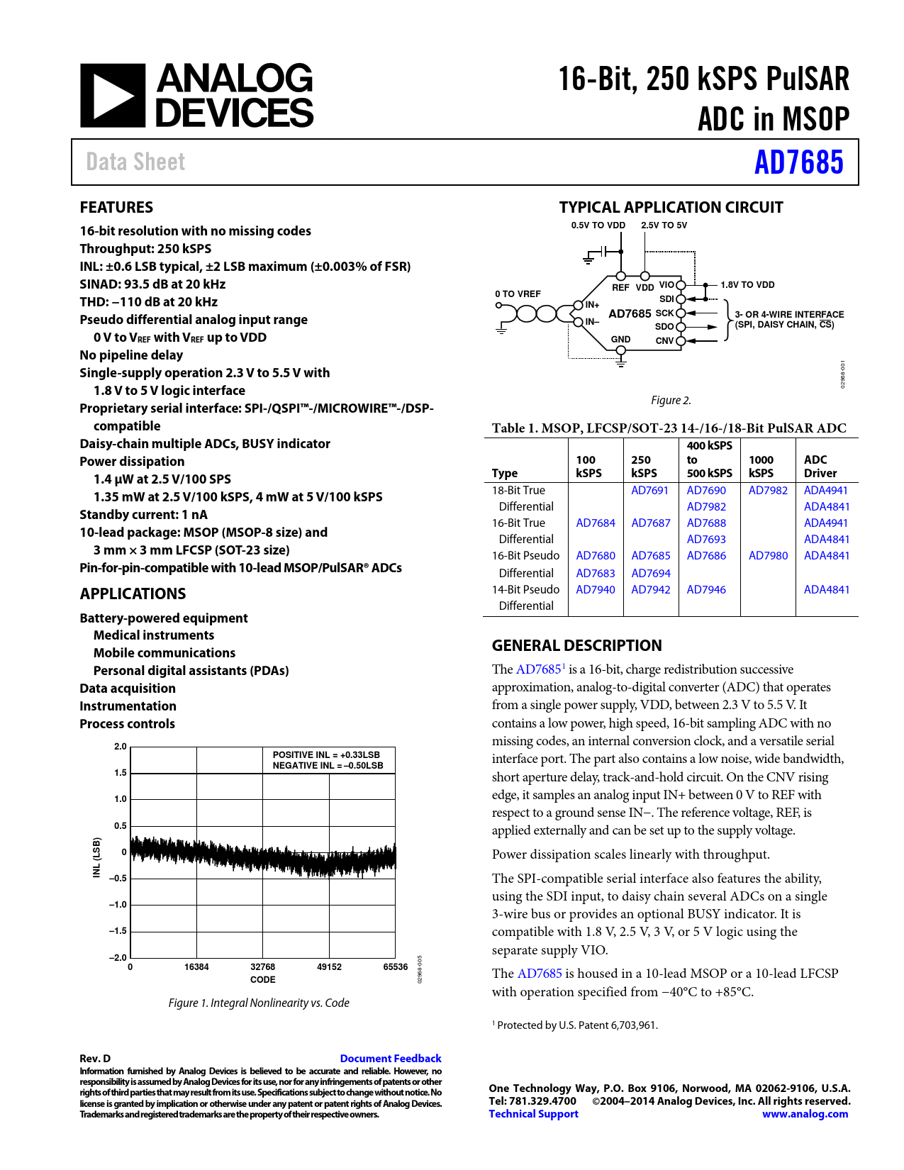 16-Bit, 250 kSPS PulSAR. ADC in MSOP. Data Sheet. AD7685. FEATURES. TYPICAL APPLICATION CIRCUIT