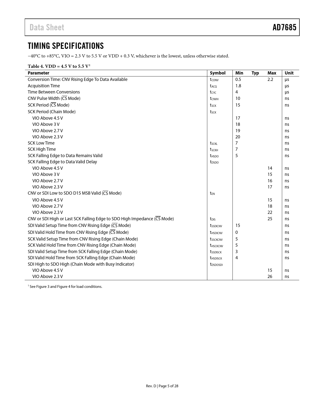 Data Sheet. AD7685. TIMING SPECIFICATIONS. Table 4. VDD = 4.5 V to 5.5 V1. Parameter. Symbol. Min. Typ. Max. Unit