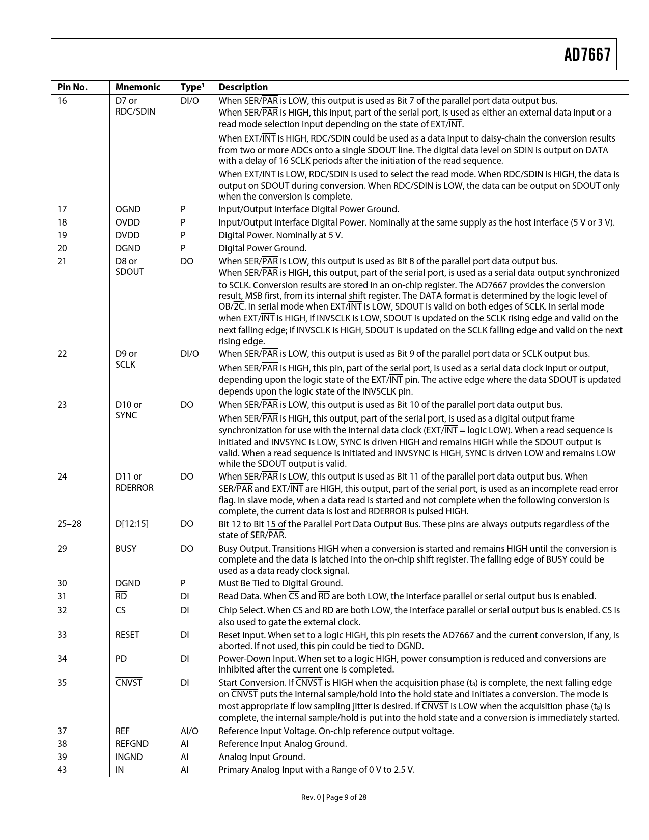 16 D7 or DI/O When SER/PAR is LOW, this output is used as Bit 7 of the parallel port data output bus. RDC/SDIN When SER/PAR is HIGH, this input, part of the serial port, is used as either an external data input or a read mode selection input depending on the state of EXT/INT. When EXT/INT is HIGH, RDC/SDIN could be used as a data input to daisy-chain the conversion results from two or more ADCs onto a single SDOUT line. The digital data level on SDIN is output on DATA with a delay of 16 SCLK periods after the initiation of the read sequence. When EXT/INT is LOW, RDC/SDIN is used to select the read mode. When RDC/SDIN is HIGH, the data is output on SDOUT during conversion. When RDC/SDIN is LOW, the data can be output on SDOUT only when the conversion is complete. 17 OGND P Input/Output Interface Digital Power Ground. 18 OVDD P Input/Output Interface Digital Power. Nominally at the same supply as the host interface (5 V or 3 V). 19 DVDD P Digital Power. Nominally at 5 V. 20 DGND P Digital Power Ground. 21 D8 or DO When SER/PAR is LOW, this output is used as Bit 8 of the parallel port data output bus. SDOUT When SER/PAR is HIGH, this output, part of the serial port, is used as a serial data output synchronized to SCLK. Conversion results are stored in an on-chip register. The AD7667 provides the conversion result, MSB first, from its internal shift register. The DATA format is determined by the logic level of OB/2C. In serial mode when EXT/INT is LOW, SDOUT is valid on both edges of SCLK. In serial mode when EXT/INT is HIGH, if INVSCLK is LOW, SDOUT is updated on the SCLK rising edge and valid on the next falling edge; if INVSCLK is HIGH, SDOUT is updated on the SCLK falling edge and valid on the next rising edge. 22 D9 or DI/O When SER/PAR is LOW, this output is used as Bit 9 of the parallel port data or SCLK output bus. SCLK When SER/PAR is HIGH, this pin, part of the serial port, is used as a serial data clock input or output, depending upon the logic state of the EXT/INT pin. The active edge where the data SDOUT is updated depends upon the logic state of the INVSCLK pin. 23 D10 or DO When SER/PAR is LOW, this output is used as Bit 10 of the parallel port data output bus. SYNC When SER/PAR is HIGH, this output, part of the serial port, is used as a digital output frame synchronization for use with the internal data clock (EXT/INT = logic LOW). When a read sequence is initiated and INVSYNC is LOW, SYNC is driven HIGH and remains HIGH while the SDOUT output is valid. When a read sequence is initiated and INVSYNC is HIGH, SYNC is driven LOW and remains LOW while the SDOUT output is valid. 24 D11 or DO When SER/PAR is LOW, this output is used as Bit 11 of the parallel port data output bus. When RDERROR SER/PAR and EXT/INT are HIGH, this output, part of the serial port, is used as an incomplete read error flag. In slave mode, when a data read is started and not complete when the following conversion is complete, the current data is lost and RDERROR is pulsed HIGH. 25–28 D[12:15] DO Bit 12 to Bit 15 of the Parallel Port Data Output Bus. These pins are always outputs regardless of the state of SER/PAR. 29 BUSY DO Busy Output. Transitions HIGH when a conversion is started and remains HIGH until the conversion is complete and the data is latched into the on-chip shift register. The falling edge of BUSY could be used as a data ready clock signal. 30 DGND P Must Be Tied to Digital Ground. 31 RD DI Read Data. When CS and RD are both LOW, the interface parallel or serial output bus is enabled. 32 CS DI Chip Select. When CS and RD are both LOW, the interface parallel or serial output bus is enabled. CS is also used to gate the external clock. 33 RESET DI Reset Input. When set to a logic HIGH, this pin resets the AD7667 and the current conversion, if any, is aborted. If not used, this pin could be tied to DGND. 34 PD DI Power-Down Input. When set to a logic HIGH, power consumption is reduced and conversions are inhibited after the current one is completed. 35 CNVST DI Start Conversion. If CNVST is HIGH when the acquisition phase (t8) is complete, the next falling edge on CNVST puts the internal sample/hold into the hold state and initiates a conversion. The mode is most appropriate if low sampling jitter is desired. If CNVST is LOW when the acquisition phase (t8) is complete, the internal sample/hold is put into the hold state and a conversion is immediately started. 37 REF AI/O Reference Input Voltage. On-chip reference output voltage. 38 REFGND AI Reference Input Analog Ground. 39 INGND AI Analog Input Ground. 43 IN AI Primary Analog Input with a Range of 0 V to 2.5 V. Rev. 0 | Page 9 of 28 Document Outline FEATURES APPLICATIONS GENERAL DESCRIPTION FUNCTIONAL BLOCK DIAGRAM PRODUCT HIGHLIGHTS SPECIFICATIONS TIMING SPECIFICATIONS ABSOLUTE MAXIMUM RATINGS ESD CAUTION PIN CONFIGURATION AND FUNCTION DESCRIPTIONS DEFINITIONS OF SPECIFICATIONS TYPICAL PERFORMANCE CHARACTERISTICS CIRCUIT INFORMATION CONVERTER OPERATION Modes Of Operation Transfer Functions TYPICAL CONNECTION DIAGRAM Analog Input Driver Amplifier Choice Voltage Reference Input Power Supply POWER DISSIPATION VERSUS THROUGHPUT CONVERSION CONTROL DIGITAL INTERFACE PARALLEL INTERFACE SERIAL INTERFACE MASTER SERIAL INTERFACE Internal Clock SLAVE SERIAL INTERFACE External Clock External Discontinuous Clock Data Read After Conversion External Clock Data Read During Conversion MICROPROCESSOR INTERFACING SPI Interface (ADSP-219x) APPLICATION HINTS BIPOLAR AND WIDER INPUT RANGES LAYOUT EVALUATING THE AD7667’S PERFORMANCE OUTLINE DIMENSIONS ORDERING GUIDE